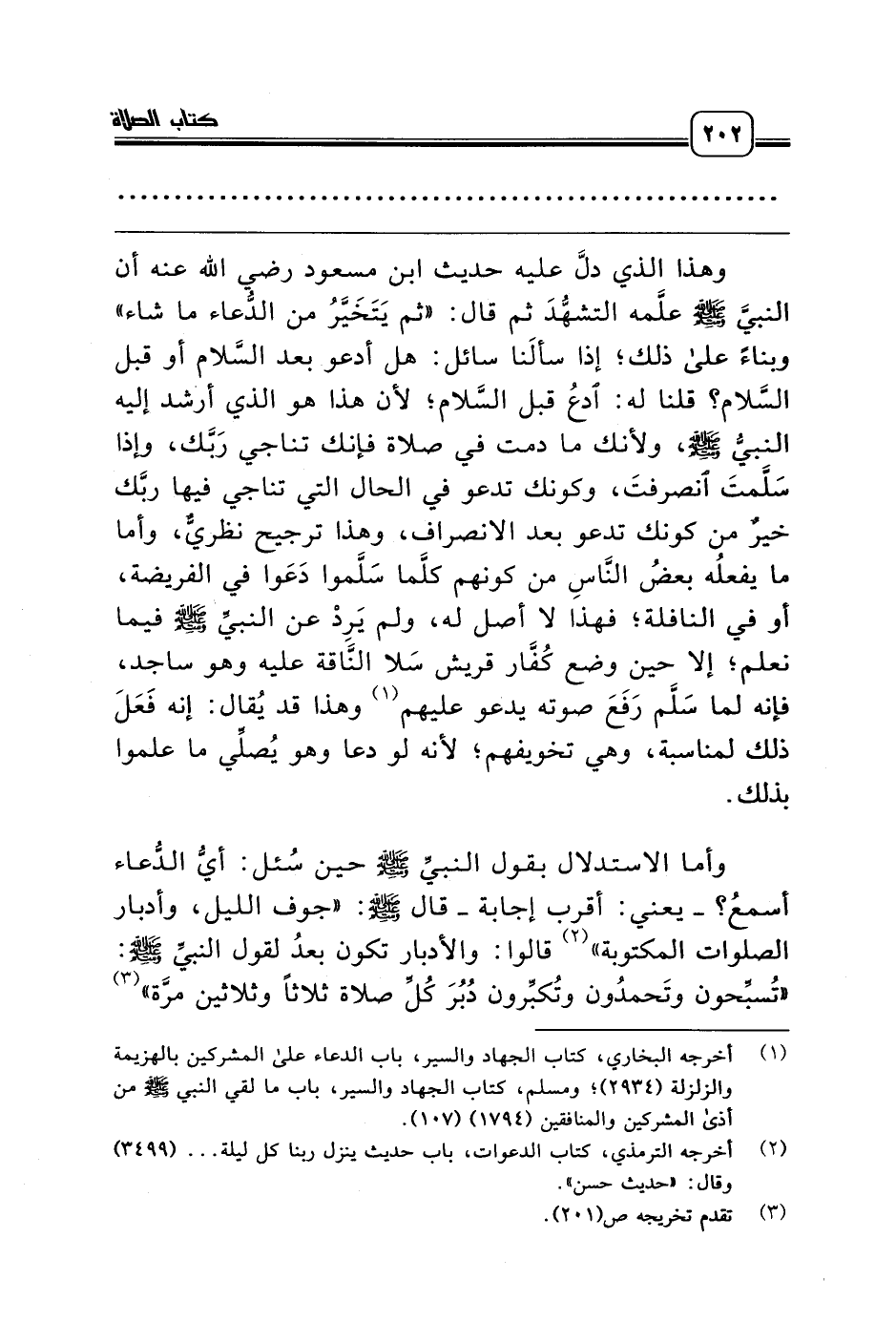 وهذا الذي دلَّ عليه حديث ابن مسعود رضي الله عنه أن النبيَّ صلّى الله عليه وسلّم علَّمه التشهُّدَ ثم قال: «ثم يَتَخَيَّرُ من الدُّعاء ما شاء» وبناءً على ذلك؛ إذا سألَنا سائل: هل أدعو بعد السَّلام أو قبل السَّلام؟ قلنا له: ادعُ قبل السَّلام؛ لأن هذا هو الذي أرشد إليه النبيُّ صلّى الله عليه وسلّم، ولأنك ما دمت في صلاة فإنك تناجي رَبَّك، وإذا سَلَّمتَ انصرفتَ، وكونك تدعو في الحال التي تناجي فيها ربَّك خيرٌ من كونك تدعو بعد الانصراف، وهذا ترجيح نظريٌّ، وأما ما يفعلُه بعضُ النَّاسِ من كونهم كلَّما سَلَّموا دَعَوا في الفريضة، أو في النافلة؛ فهذا لا أصل له، ولم يَرِدْ عن النبيِّ صلّى الله عليه وسلّم فيما نعلم؛ إلا حين وضع كُفَّار قريش سَلا النَّاقة عليه وهو ساجد، فإنه لما سَلَّم رَفَعَ صوته يدعو عليهم (¬1) وهذا قد يُقال: إنه فَعَلَ ذلك لمناسبة، وهي تخويفهم؛ لأنه لو دعا وهو يُصلِّي ما علموا بذلك.