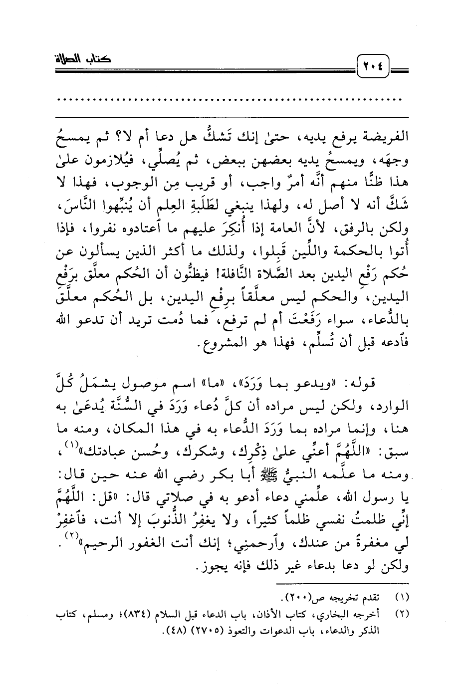 الفريضة يرفع يديه، حتى إنك تَشكُّ هل دعا أم لا؟ ثم يمسحُ وجهَه، ويمسحُ يديه بعضهن ببعض، ثم يُصلِّي، فيُلازمون على هذا ظنًّا منهم أنَّه أمرٌ واجب، أو قريب مِن الوجوب، فهذا لا شَكَّ أنه لا أصل له، ولهذا ينبغي لطَلَبةِ العِلم أن يُنبِّهوا النَّاسَ، ولكن بالرفق، لأنَّ العامة إذا أُنكِرَ عليهم ما اعتادوه نفروا، فإذا أُتوا بالحكمة واللِّين قَبِلوا، ولذلك ما أكثر الذين يسألون عن حُكم رَفْعِ اليدين بعد الصَّلاة النَّافلة! فيظنُّون أن الحُكم معلَّق برَفْعِ اليدين، والحكم ليس معلَّقاً برِفْعِ اليدين، بل الحُكم معلَّق بالدُّعاء، سواء رَفَعْتَ أم لم ترفع، فما دُمت تريد أن تدعو الله فادعه قبل أن تُسلِّم، فهذا هو المشروع.