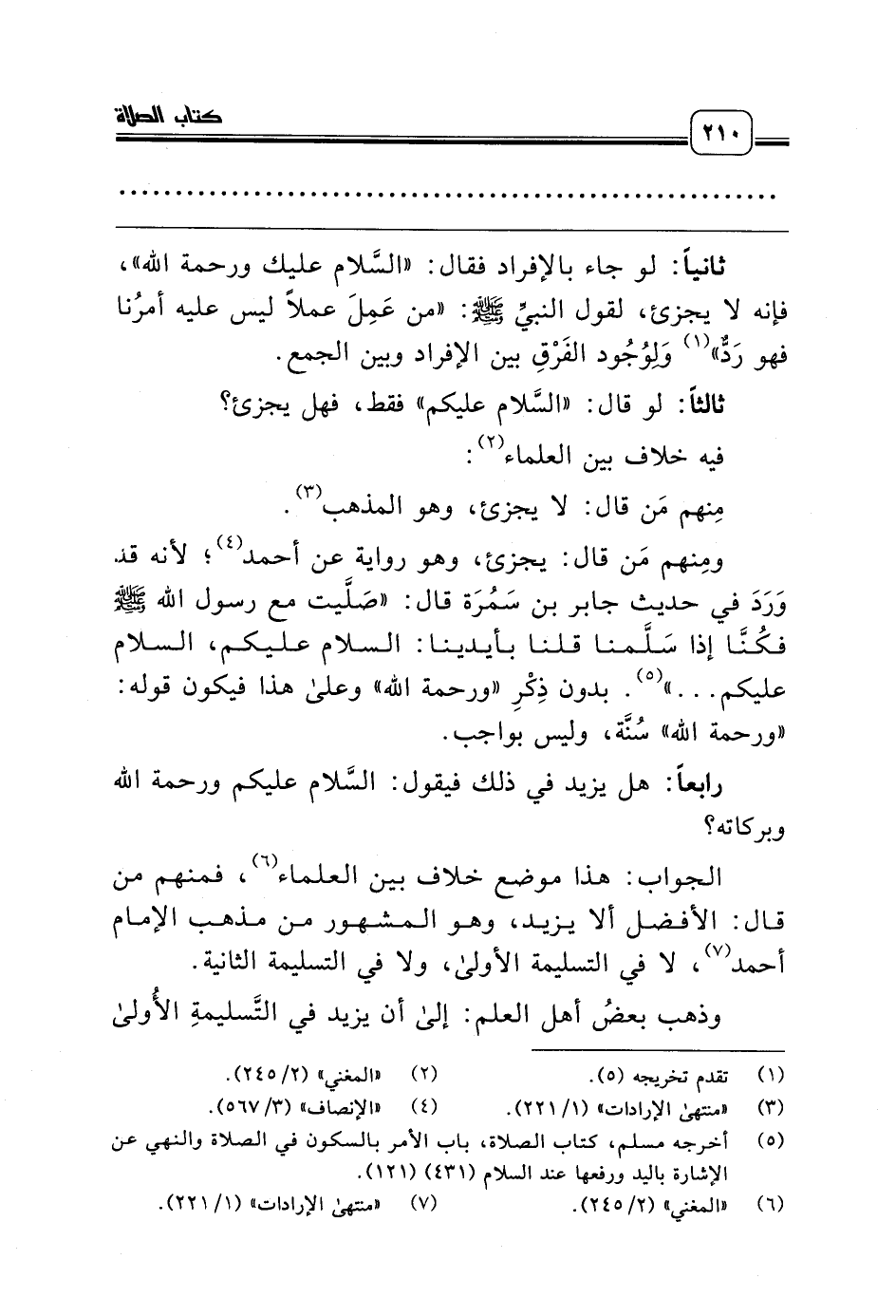 ثانياً: لو جاء بالإفراد فقال: «السَّلام عليك ورحمة الله»، فإنه لا يجزئ، لقول النبيِّ صلّى الله عليه وسلّم: «من عَمِلَ عملاً ليس عليه أمرُنا فهو رَدٌّ» (¬1) وَلِوُجُود الفَرْقِ بين الإفراد وبين الجمع.