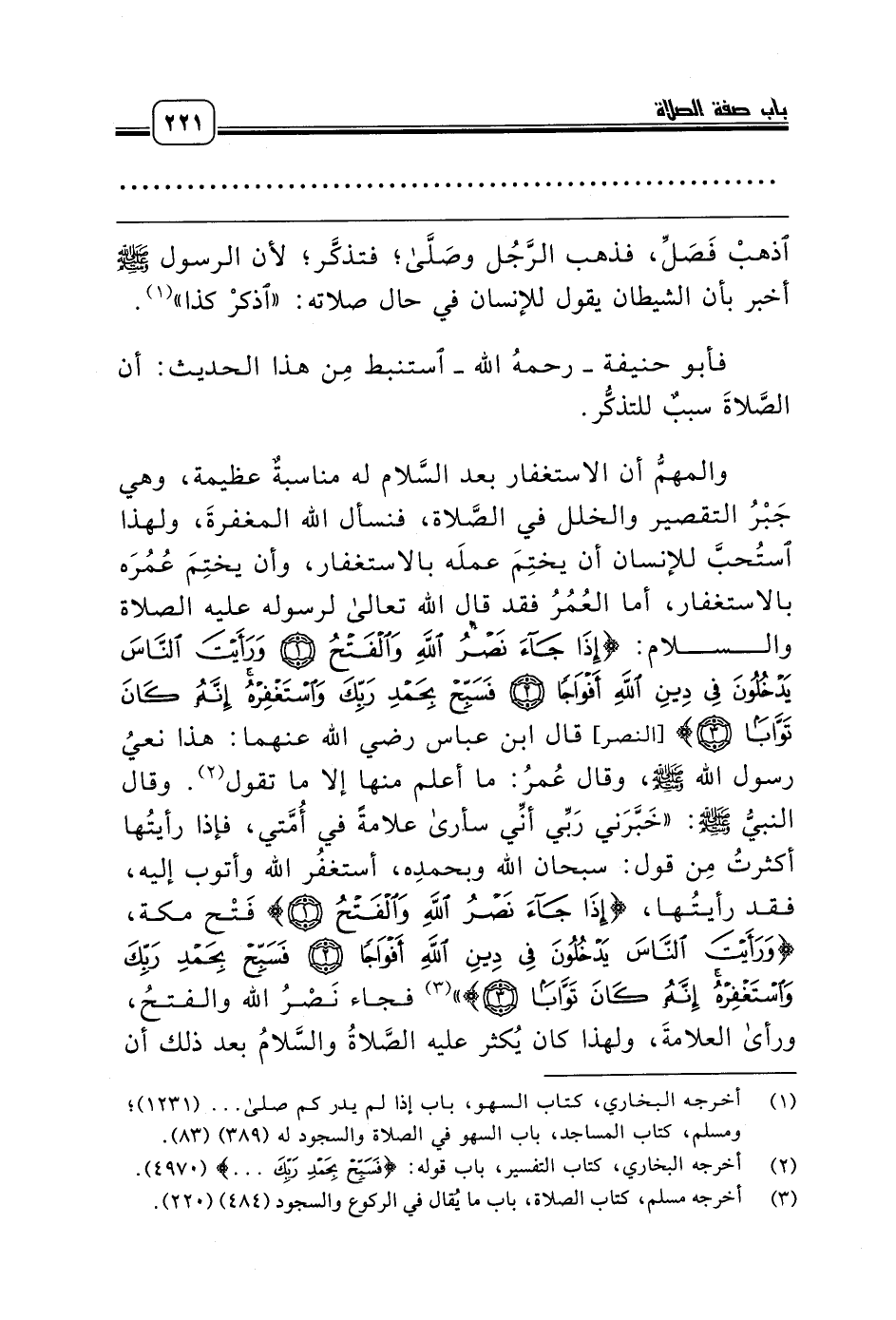 والمهمُّ أن الاستغفار بعد السَّلام له مناسبةٌ عظيمة، وهي جَبْرُ التقصير والخلل في الصَّلاة، فنسأل الله المغفرةَ، ولهذا استُحبَّ للإنسان أن يختِمَ عملَه بالاستغفار، وأن يختِمَ عُمُرَه بالاستغفار، أما العُمُرُ فقد قال الله تعالى لرسوله عليه الصلاة والسلام: {إِذَا جَاءَ نَصْرُ اللَّهِ وَالْفَتْحُ *وَرَأَيْتَ النَّاسَ يَدْخُلُونَ فِي دِينِ اللَّهِ أَفْوَاجًا *فَسَبِّحْ بِحَمْدِ رَبِّكَ وَاسْتَغْفِرْهُ إِنَّهُ كَانَ تَوَّابًا *} [النصر] قال ابن عباس رضي الله عنهما: هذا نعيُ رسول الله صلّى الله عليه وسلّم، وقال عُمرُ: ما أعلم منها إلا ما تقول (¬2). وقال النبيُّ صلّى الله عليه وسلّم: «خَبَّرَني رَبِّي أنِّي سأرى علامةً في أُمَّتي، فإذا رأيتُها أكثرتُ مِن قول: سبحان الله وبحمدِه، أستغفُر الله وأتوب إليه، فقد رأيتُها، {إِذَا جَاءَ نَصْرُ اللَّهِ وَالْفَتْحُ *} فَتْح مكة، {وَرَأَيْتَ النَّاسَ يَدْخُلُونَ فِي دِينِ اللَّهِ أَفْوَاجًا *فَسَبِّحْ بِحَمْدِ رَبِّكَ وَاسْتَغْفِرْهُ إِنَّهُ كَانَ تَوَّابًا *}» (¬3) فجاء نَصْرُ الله والفتحُ، ورأى العلامةَ، ولهذا كان يُكثر عليه الصَّلاةُ والسَّلامُ بعد ذلك أن