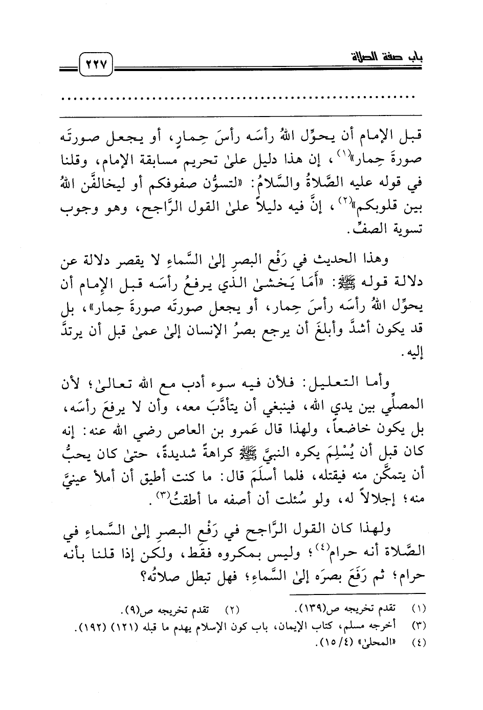 وأما التعليل: فلأن فيه سوء أدب مع الله تعالى؛ لأن المصلِّي بين يدي الله، فينبغي أن يتأدَّبَ معه، وأن لا يرفعَ رأسَه، بل يكون خاضعاً، ولهذا قال عَمرو بن العاص رضي الله عنه: إنه كان قبل أن يُسْلِمَ يكره النبيَّ صلّى الله عليه وسلّم كراهةً شديدةً، حتى كان يحبُّ أن يتمكَّن منه فيقتله، فلما أسلَمَ قال: ما كنت أطيق أن أملأ عينيَّ منه؛ إجلالاً له، ولو سُئلت أن أصفه ما أطقتُ (¬3).