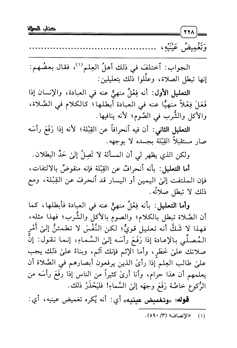 وأما التعليل: بأنه فِعْلٌ منهيٌّ عنه في العبادة فأبطلها، كما أن الصَّلاة تبطل بالكلام؛ والصوم بالأكل والشُّرب؛ فهذا مثله، فهذا لا شَكَّ أنه تعليل قويٌّ؛ لكن النَّفْسَ لا تطمئنُّ إلى أَمْرِ المُصلِّي بالإعادة إذا رَفَعَ رأسَه إلى السَّماءِ، إنما نقول: إنَّ صلاتك على خَطَرٍ، وأما الإثم فإنك آثم، وبناءً على ذلك يجب على طالب العِلم إذا رأى الذين يرفعون أبصارهم في الصَّلاة أن يعلمهم أن هذا حرام، وأنا أرى كثيراً من الناس إذا رفَعَ رأسَه من الرُّكوع خاصَّة رَفَعَ وجهَه إلى السَّماءِ! فليَحْذَرْ ذلك.