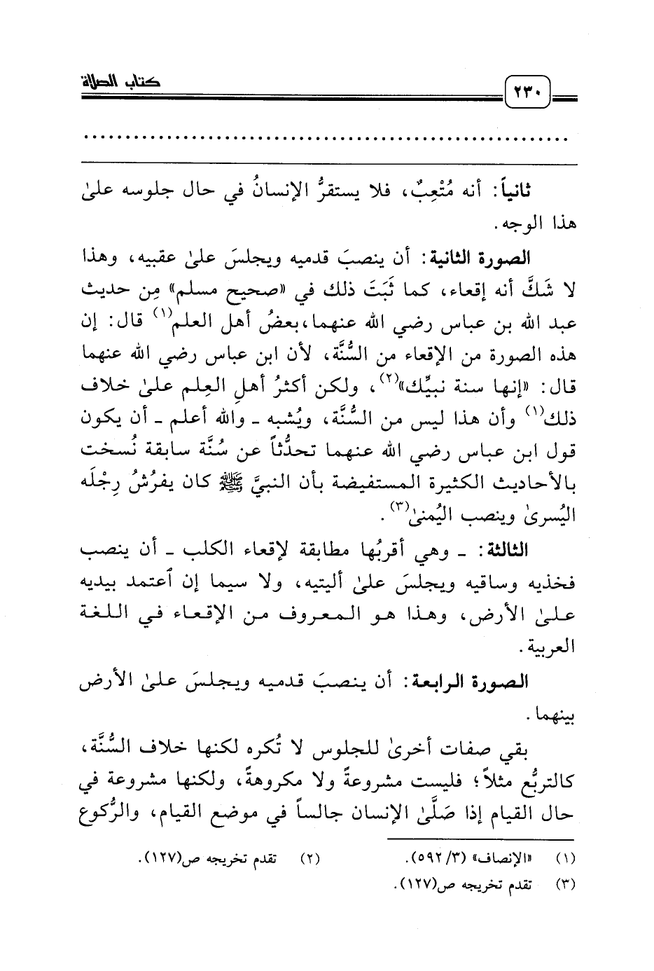 الصورة الثانية: أن ينصبَ قدميه ويجلسَ على عقبيه، وهذا لا شَكَّ أنه إقعاء، كما ثَبَتَ ذلك في «صحيح مسلم» مِن حديث عبد الله بن عباس رضي الله عنهما، بعضُ أهل العلم (¬1) قال: إن هذه الصورة من الإقعاء من السُّنَّة، لأن ابن عباس رضي الله عنهما قال: «إنها سنة نبيِّك» (¬2)، ولكن أكثرُ أهلِ العِلم على خلاف ذلك (432) وأن هذا ليس من السُّنَّة، ويُشبه ـ والله أعلم ـ أن يكون قول ابن عباس رضي الله عنهما تحدُّثاً عن سُنَّة سابقة نُسخت بالأحاديث الكثيرة المستفيضة بأن النبيَّ صلّى الله عليه وسلّم كان يفرُشُ رِجْلَه اليُسرى وينصب اليُمنى (¬3).