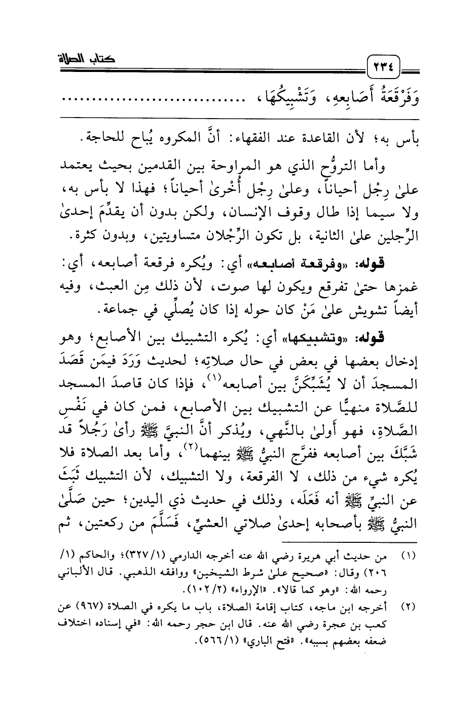 قوله: «وتشبيكها» أي: يُكره التشبيك بين الأصابع؛ وهو إدخال بعضها في بعض في حال صلاتِه؛ لحديث وَرَدَ فيمَن قَصَدَ المسجدَ أن لا يُشَبِّكَنَّ بين أصابعه (¬1)، فإذا كان قاصدَ المسجد للصَّلاة منهيًّا عن التشبيك بين الأصابع، فمن كان في نَفْسِ الصَّلاةِ، فهو أَولى بالنَّهي، ويُذكر أنَّ النبيَّ صلّى الله عليه وسلّم رأى رَجُلاً قد شَبَّكَ بين أصابعه ففرَّج النبيُّ صلّى الله عليه وسلّم بينهما (¬2)، وأما بعد الصلاة فلا يُكره شيء من ذلك، لا الفرقعة، ولا التشبيك، لأن التشبيك ثَبَثَ عن النبيِّ صلّى الله عليه وسلّم أنه فَعَلَه، وذلك في حديث ذي اليدين؛ حين صَلَّى النبيُّ صلّى الله عليه وسلّم بأصحابه إحدى صلاتي العشيِّ، فَسَلَّمَ من ركعتين، ثم