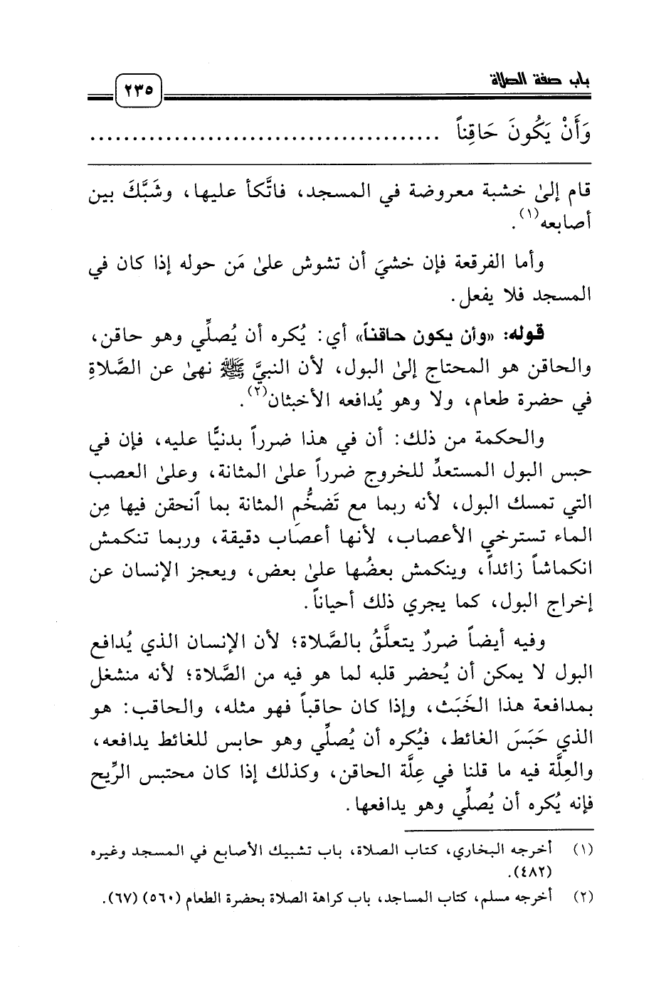 قوله: «وأن يكون حاقناً» أي: يُكره أن يُصلِّي وهو حاقن، والحاقن هو المحتاج إلى البول، لأن النبيَّ صلّى الله عليه وسلّم نهى عن الصَّلاةِ في حضرة طعام، ولا وهو يُدافعه الأخبثان (¬2).