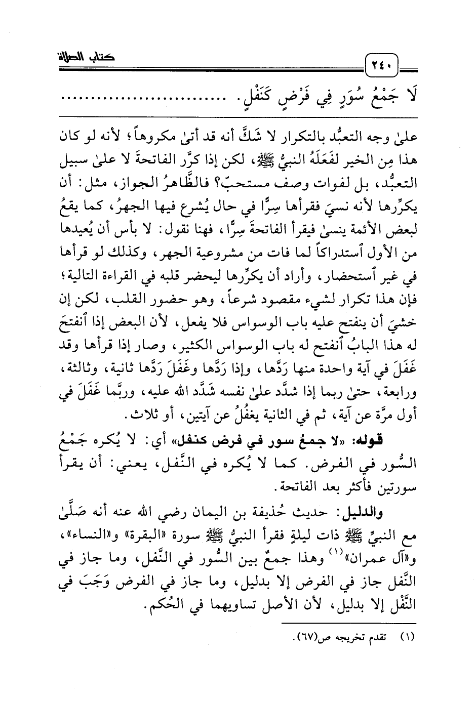 والدليل: حديث حُذيفة بن اليمان رضي الله عنه أنه صَلَّى مع النبيِّ صلّى الله عليه وسلّم ذات ليلةٍ فقرأ النبيُّ صلّى الله عليه وسلّم سورة «البقرة» و «النساء»، و «آل عمران» (¬1) وهذا جمعٌ بين السُّور في النَّفل، وما جاز في النَّفل جاز في الفرض إلا بدليل، وما جاز في الفرض وَجَبَ في النَّفْل إلا بدليل، لأن الأصل تساويهما في الحُكم.