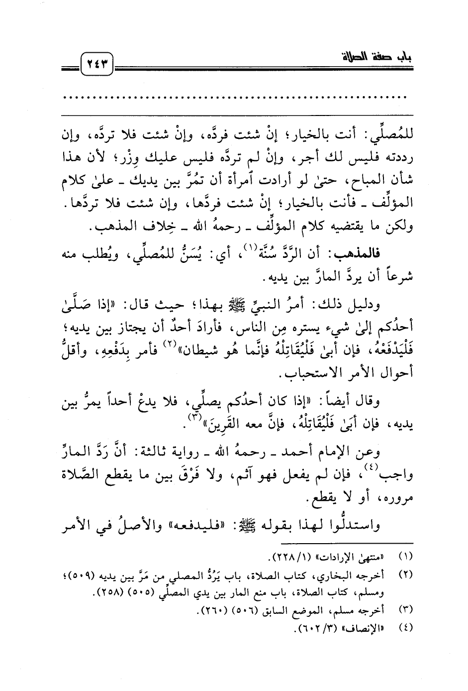 للمُصلِّي: أنت بالخيار؛ إنْ شئت فردَّه، وإنْ شئت فلا تردَّه، وإن رددته فليس لك أجر، وإنْ لم تردَّه فليس عليك وِزْر؛ لأن هذا شأن المباح، حتى لو أرادت امرأة أن تمُرَّ بين يديك ـ على كلام المؤلِّف ـ فأنت بالخيار؛ إنْ شئت فردَّها، وإن شئت فلا تردَّها. ولكن ما يقتضيه كلام المؤلِّف ـ رحمه الله ـ خِلاف المذهب.
