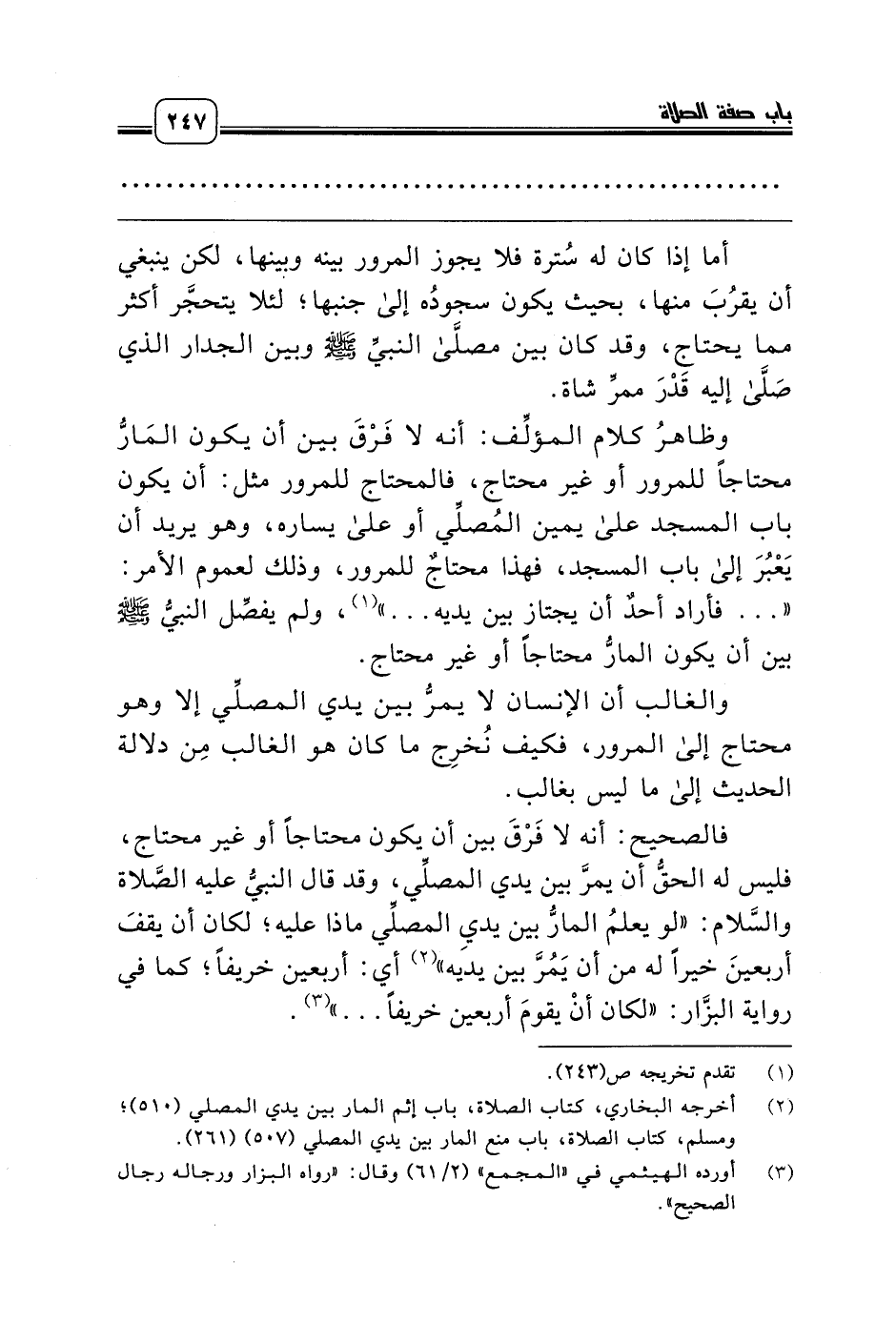 وظاهرُ كلام المؤلِّف: أنه لا فَرْقَ بين أن يكون المَارُّ محتاجاً للمرور أو غير محتاج، فالمحتاج للمرور مثل: أن يكون باب المسجد على يمين المُصلِّي أو على يساره، وهو يريد أن يَعْبُرَ إلى باب المسجد، فهذا محتاجٌ للمرور، وذلك لعموم الأمر: « ... فأراد أحدٌ أن يجتاز بين يديه ... » (¬1)، ولم يفصِّل النبيُّ صلّى الله عليه وسلّم بين أن يكون المارُّ محتاجاً أو غير محتاج.