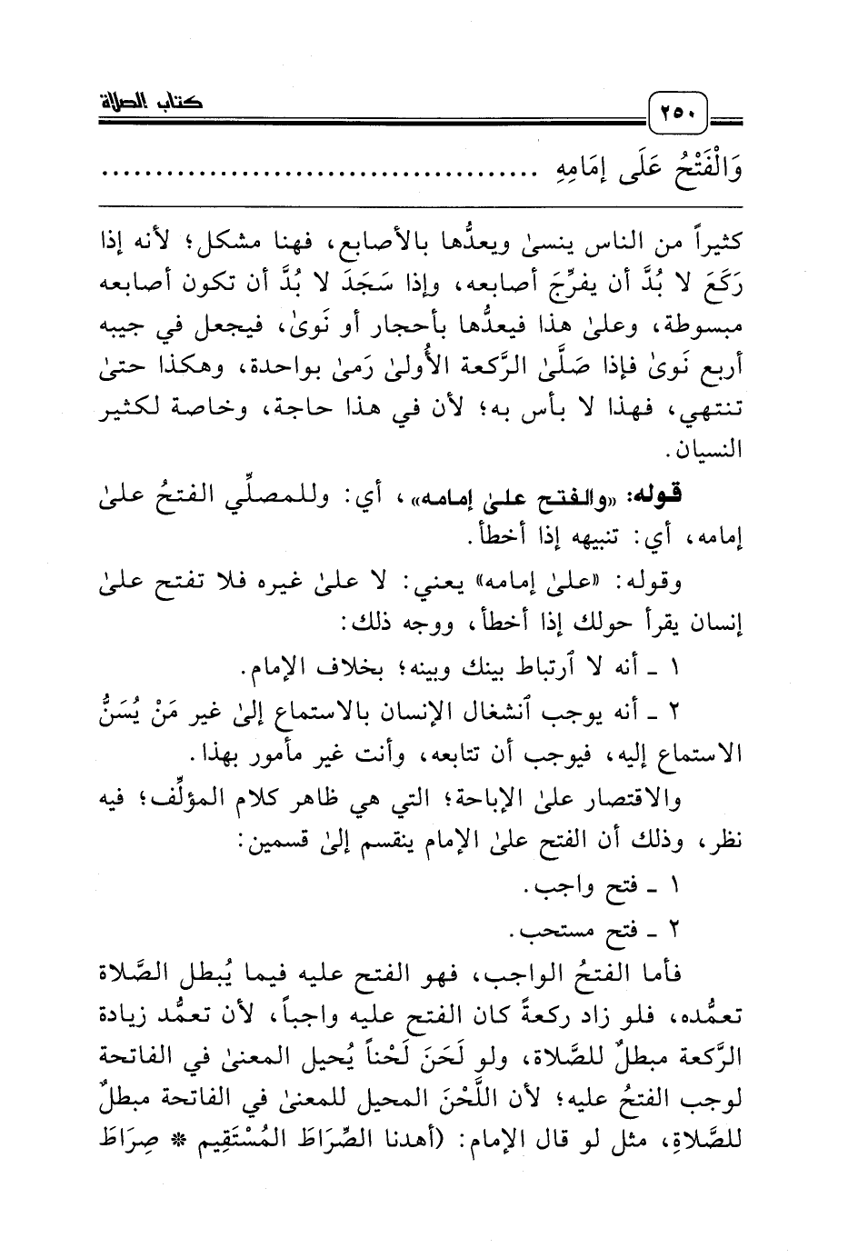 فأما الفتحُ الواجب، فهو الفتح عليه فيما يُبطل الصَّلاة تعمُّده، فلو زاد ركعةً كان الفتح عليه واجباً، لأن تعمُّد زيادة الرَّكعة مبطلٌ للصَّلاة، ولو لَحَنَ لَحْناً يُحيل المعنى في الفاتحة لوجب الفتحُ عليه؛ لأن اللَّحْنَ المحيل للمعنى في الفاتحة مبطلٌ للصَّلاةِ، مثل لو قال الإمام: (أهدنا الصِّرَاطَ المُسْتَقِيم * صِرَاطَ