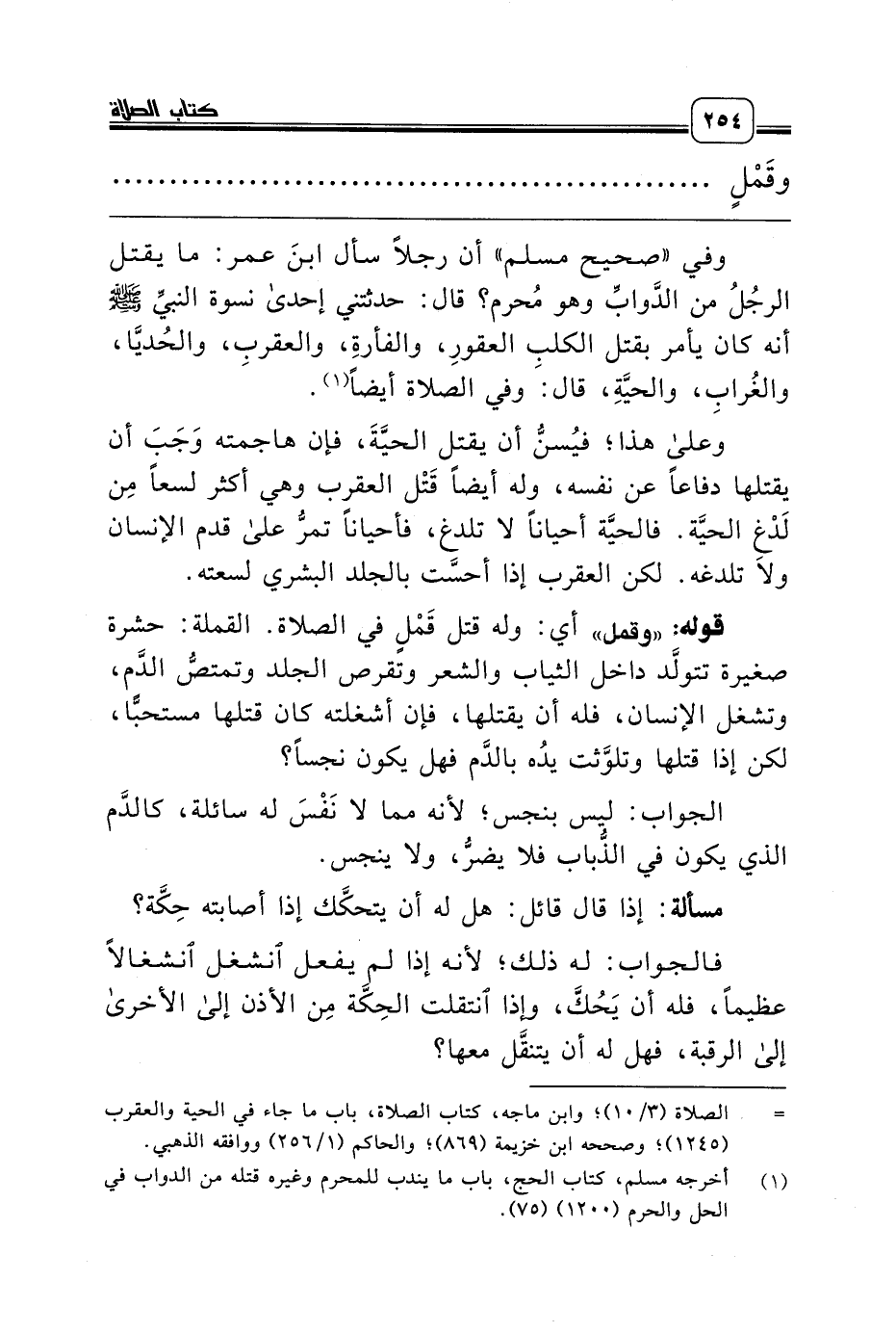 وفي «صحيح مسلم» أن رجلاً سأل ابنَ عمر: ما يقتل الرجُلُ من الدَّوابِّ وهو مُحرم؟ قال: حدثتني إحدى نسوة النبيِّ صلّى الله عليه وسلّم أنه كان يأمر بقتل الكلبِ العقورِ، والفأرةِ، والعقربِ، والحُديَّا، والغُرابِ، والحيَّةِ، قال: وفي الصلاة أيضاً (¬1).