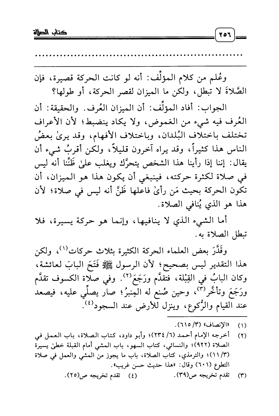 وقَدَّرَ بعض العلماء الحركة الكثيرة بثلاث حركات (¬1)، ولكن هذا التقدير ليس بصحيح؛ لأن الرسول صلّى الله عليه وسلّم فَتَحَ البابَ لعائشة، وكان البابُ في القِبْلة، فتقدَّم ورَجَعَ (¬2). وفي صلاة الكسوف تقدَّم ورَجَعَ وتأخَّر (¬3)، وحين صُنع له المِنبرُ؛ صار يصلِّي عليه، فيصعد عند القيام والرُّكوع، وينزل للأرض عند السجود (¬4).
