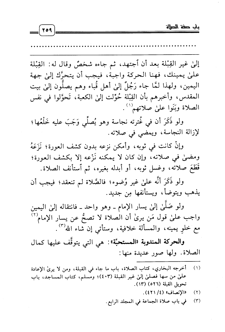 إلى غير القِبْلة بعد أن اجتهد، ثم جاءه شخصٌ وقال له: القِبْلة على يمينك، فهنا الحركة واجبة، فيجب أن يتحرَّك إلى جهة اليمين، ولهذا لمَّا جاء رَجُلٌ إلى أهل قُباء وهم يصلُّون إلى بيت المقدس، وأخبرهم بأن القِبْلة حُوِّلت إلى الكعبة، تَحوَّلوا في نفس الصلاة وبَنَوا على صلاتهم (¬1).