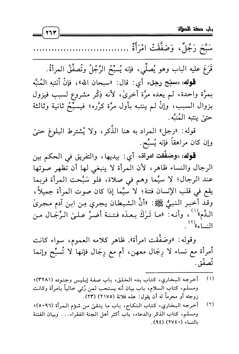 قوله: «وصَفَّقت امرأة» أي: بيديها، والتفريق في الحكم بين الرجال والنساء ظاهر، لأن المرأة لا ينبغي لها أن تظهر صوتها عند الرجال؛ لا سيَّما وهم في صلاة، فلو سَبَّحت المرأة فربما يقع في قلب الإنسان فتنة؛ لا سيَّما إذا كان صوت المرأة جميلاً، وقد أخبر النبيُّ صلّى الله عليه وسلّم: «أنَّ الشيطان يجري مِن ابن آدم مجرى الدَّم» (¬1)، وأنه: «ما تَرَكَ بعدَه فتنة أضرَّ على الرِّجَال من النساء» (¬2).