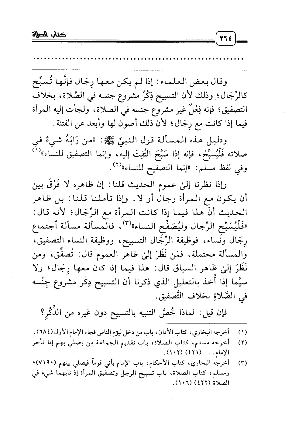 وإذا نظرنا إلى عموم الحديث قلنا: إن ظاهره لا فَرْقَ بين أن يكون مع المرأة رجال أو لا. وإذا تأملنا قلنا: بل ظاهر الحديث أنّ هذا فيما إذا كانت المرأة مع الرِّجَال؛ لأنه قال: «فَلْيُسَبِّحِ الرِّجال وليُصَفِّحِ النساء» (¬3)، فالمسألة مسألة اجتماع رِجَال ونساء، فوظيفة الرِّجَال التسبيح، ووظيفة النساء التصفيق، والمسألة محتملة، فمَن نَظَرَ إلى ظاهر العموم قال: تُصفِّق، ومن نَظَرَ إلى ظاهر السياق قال: هذا فيما إذا كان معها رِجَال؛ ولا سيَّما إذا أُخذ بالتعليل الذي ذكرنا أن التسبيح ذِكْر مشروع جِنْسه في الصَّلاةِ بخلاف التَّصفيق.