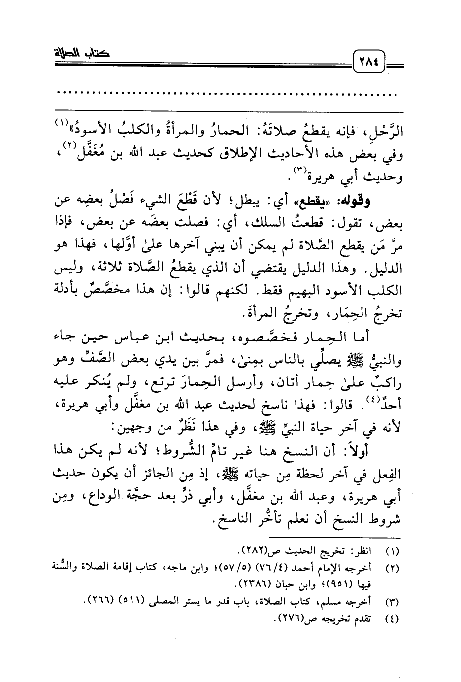 أما الحِمار فخصَّصوه، بحديث ابن عباس حين جاء والنبيُّ صلّى الله عليه وسلّم يصلِّي بالناس بمِنى، فمرَّ بين يدي بعض الصَّفِّ وهو راكبٌ على حِمار أتان، وأرسل الحِمارَ ترتع، ولم يُنكر عليه أحدٌ (¬4). قالوا: فهذا ناسخ لحديث عبد الله بن مغفَّل وأبي هريرة، لأنه في آخر حياة النبيِّ صلّى الله عليه وسلّم، وفي هذا نَظَرٌ من وجهين: