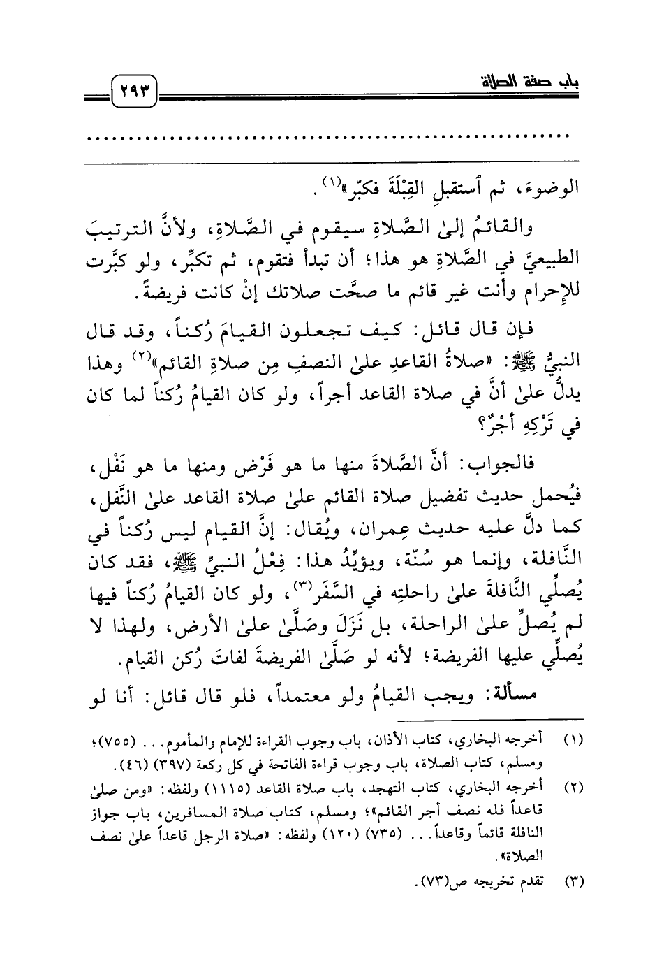 فإن قال قائل: كيف تجعلون القيامَ رُكناً، وقد قال النبيُّ صلّى الله عليه وسلّم: «صلاةُ القاعدِ على النصفِ مِن صلاةِ القائم» (¬2) وهذا يدلُّ على أنَّ في صلاة القاعد أجراً، ولو كان القيامُ رُكناً لما كان في تَرْكِهِ أجْرٌ؟