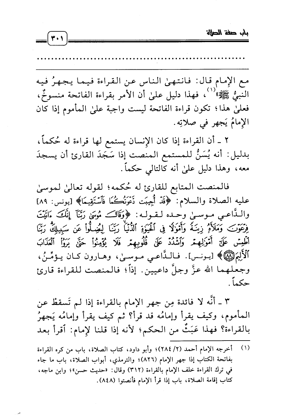 مع الإِمام قال: فانتهى الناس عن القراءة فيما يجهرُ فيه النبيُّ صلّى الله عليه وسلّم» (¬1)، فهذا دليل على أن الأمر بقراءة الفاتحة منسوخٌ، فعلى هذا؛ تكون قراءة الفاتحة ليست واجبة على المأموم إذا كان الإِمامُ يَجهر في صلاتِه.