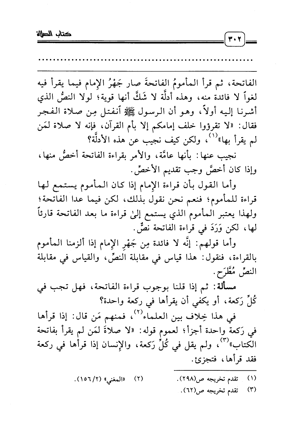 الفاتحة، ثم قرأ المأمومُ الفاتحةَ صار جَهْرُ الإِمام فيما يقرأ فيه لغواً لا فائدة منه، وهذه أدلَّة لا شَكَّ أنها قوية؛ لولا النصُّ الذي أشرنا إليه أولاً، وهو أن الرسول صلّى الله عليه وسلّم انفتل مِن صلاة الفجر فقال: «لا تقرؤوا خلف إمامكم إلا بأم القرآن، فإنه لا صلاة لمَن لم يقرأ بها» (¬1)، ولكن كيف نجيب عن هذه الأدلَّة؟