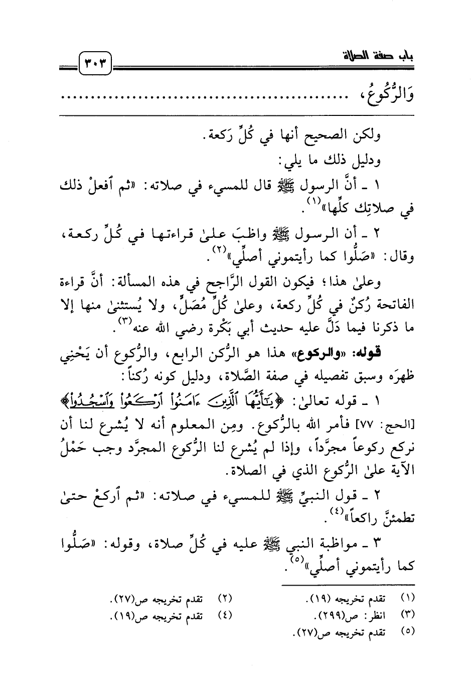 2 ـ قول النبيِّ صلّى الله عليه وسلّم للمسيء في صلاته: «ثم اركعْ حتى تطمئنَّ راكعاً» (¬4).