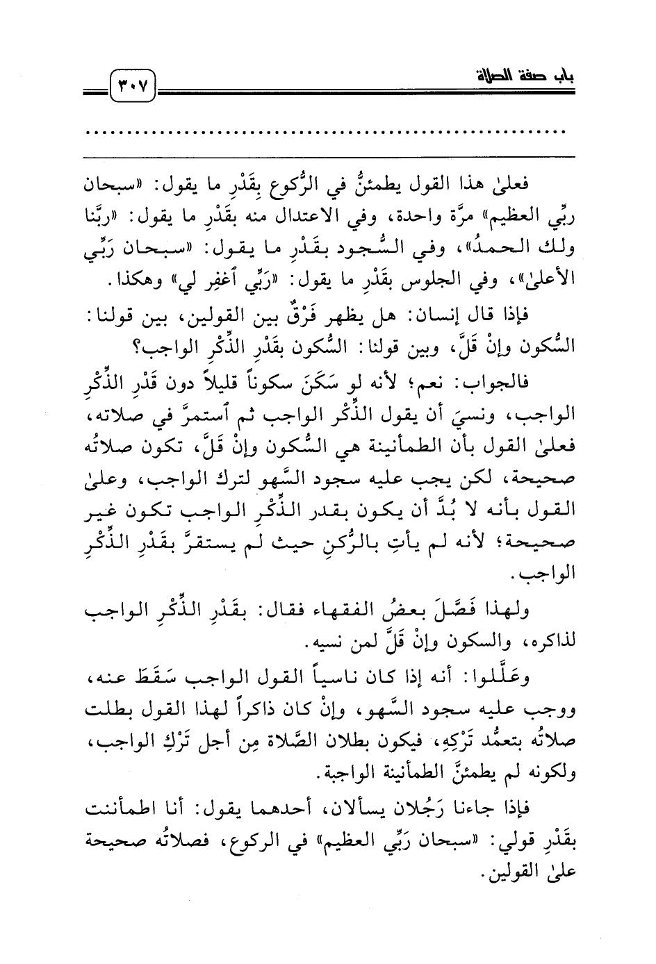 ولهذا فَصَّلَ بعضُ الفقهاء فقال: بقَدْرِ الذِّكْرِ الواجب لذاكره، والسكون وإنْ قَلَّ لمن نسيه.
