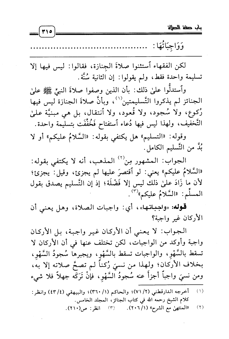 الجواب: المشهور مِن (¬2) المذهب، أنه لا يكتفي بقوله: «السَّلامُ عليكم» يعني: لو اقتصرَ عليها لم يجزئ، وقيل: يجزئ؛ لأن ما زَادَ على ذلك ليس إلا فَضْلَة؛ إذ إن التَّسليم يصدق بقول المسلِّم: «السَّلامُ عليكم» (¬3).