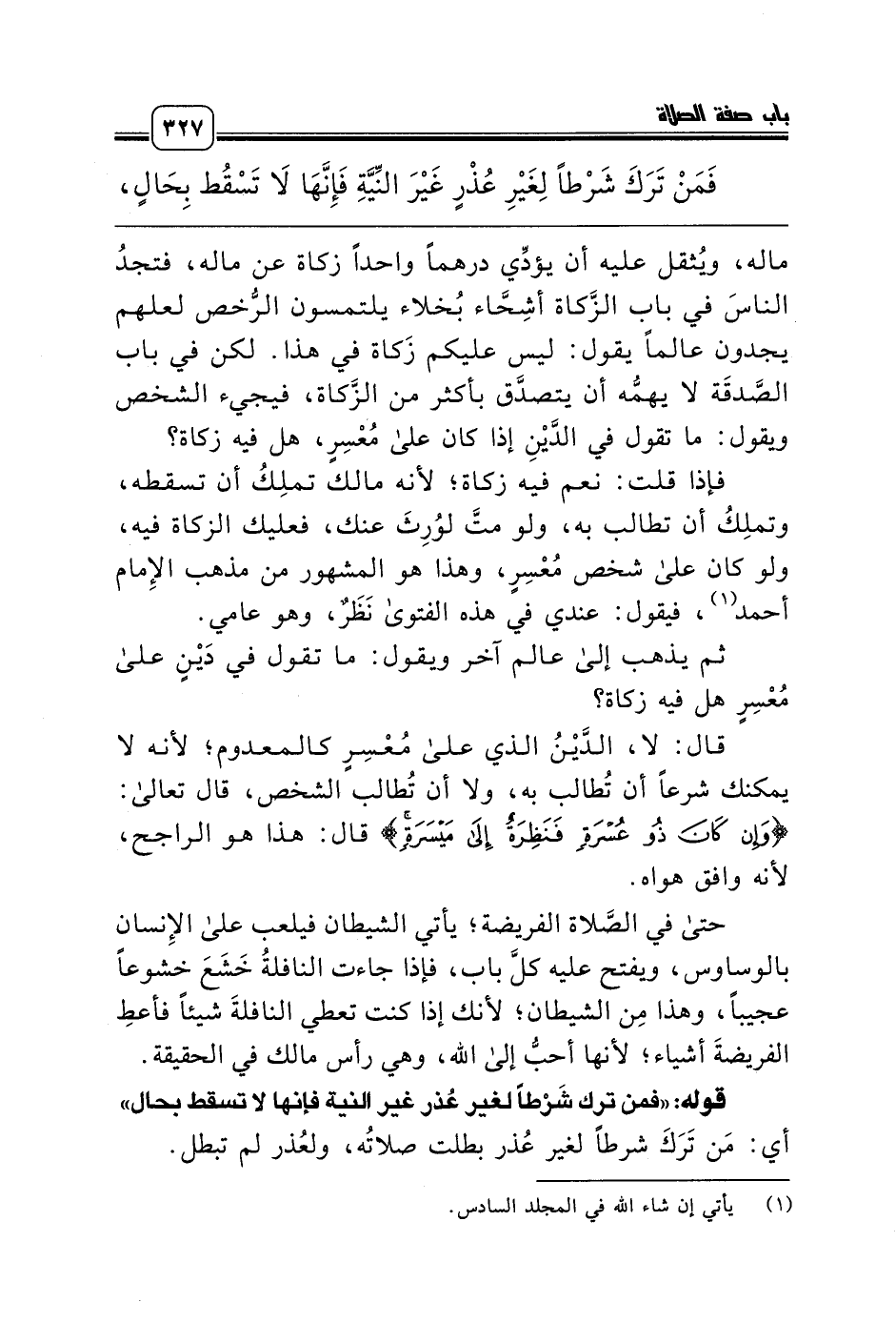 قال: لا، الدَّيْنُ الذي على مُعْسِرٍ كالمعدوم؛ لأنه لا يمكنك شرعاً أن تُطالب به، ولا أن تُطالب الشخص، قال تعالى: {وَإِنْ كَانَ ذُو عُسْرَةٍ فَنَظِرَةٌ إِلَى مَيْسَرَةٍ} قال: هذا هو الراجح، لأنه وافق هواه.