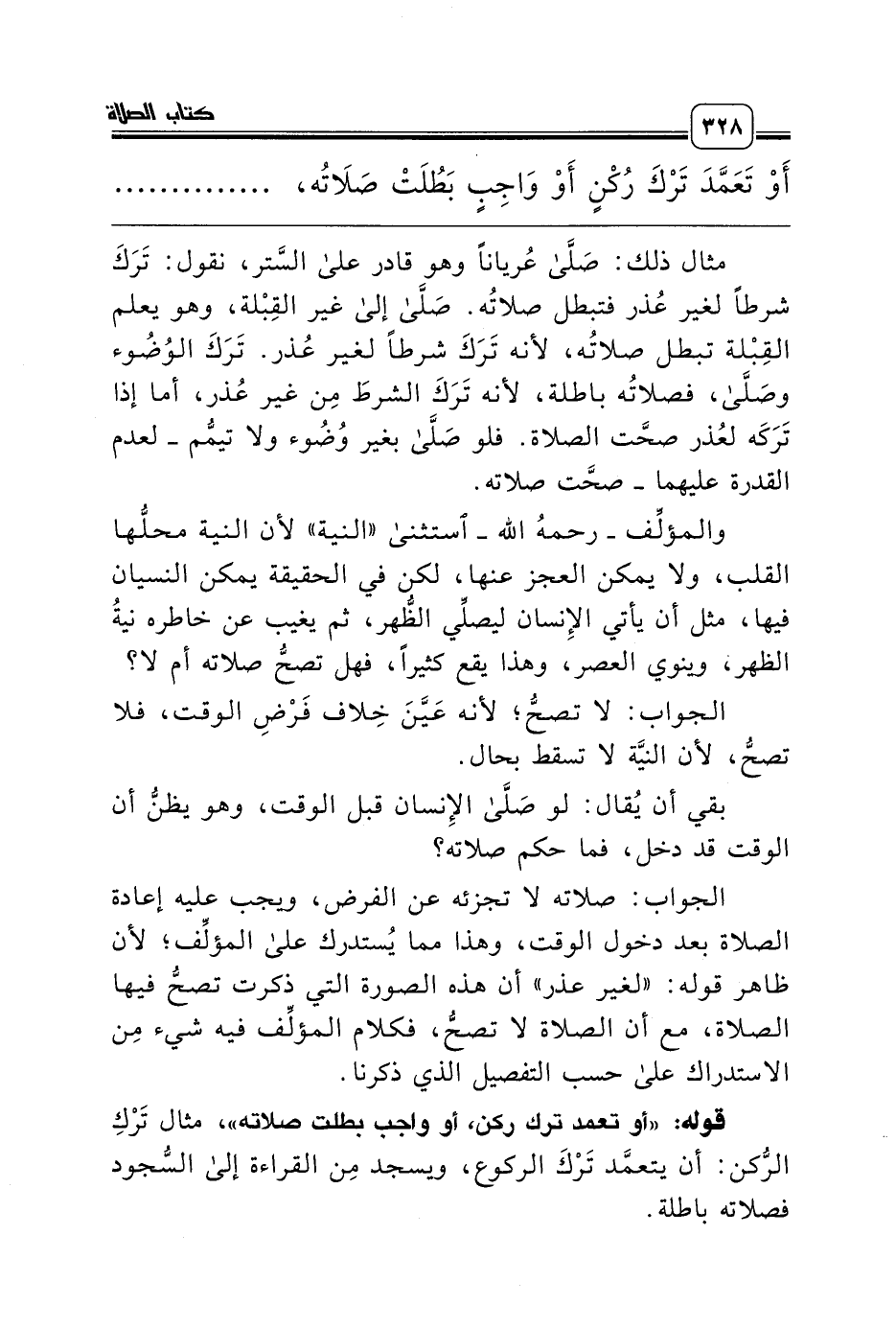أَوْ تَعَمَّدَ تَرْكَ رُكْنٍ أَوْ وَاجِبٍ بَطُلَتْ صَلاَتُه ..........
