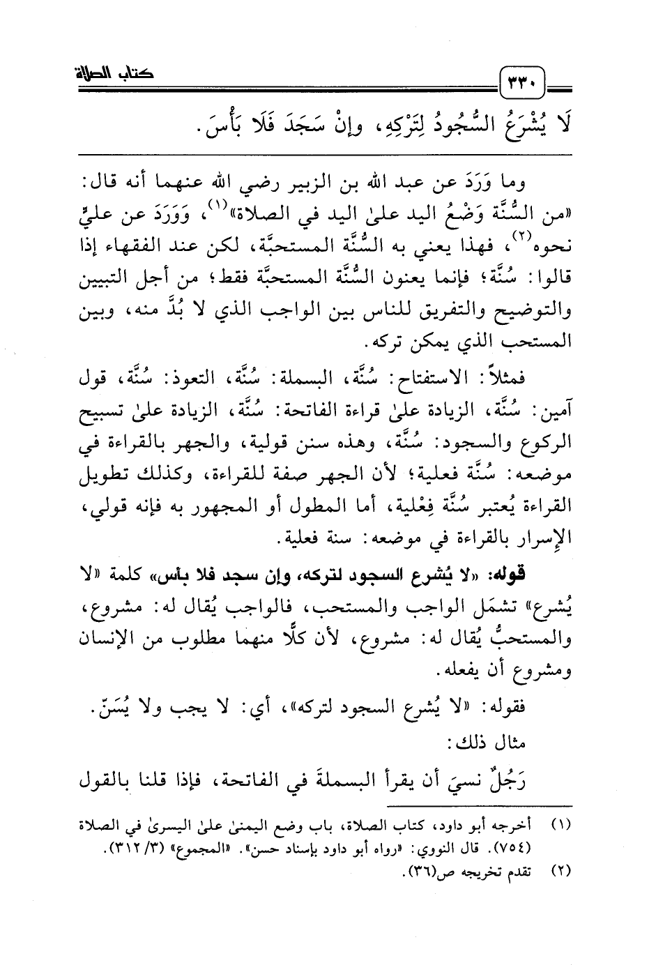 وما وَرَدَ عن عبد الله بن الزبير رضي الله عنهما أنه قال: «من السُّنَّة وَضْعُ اليد على اليد في الصلاة» (¬1)، وَوَرَدَ عن عليٍّ نحوه (¬2)، فهذا يعني به السُّنَّة المستحبَّة، لكن عند الفقهاء إذا قالوا: سُنَّة؛ فإنما يعنون السُّنَّة المستحبَّة فقط؛ من أجل التبيين والتوضيح والتفريق للناس بين الواجب الذي لا بُدَّ منه، وبين المستحب الذي يمكن تركه.