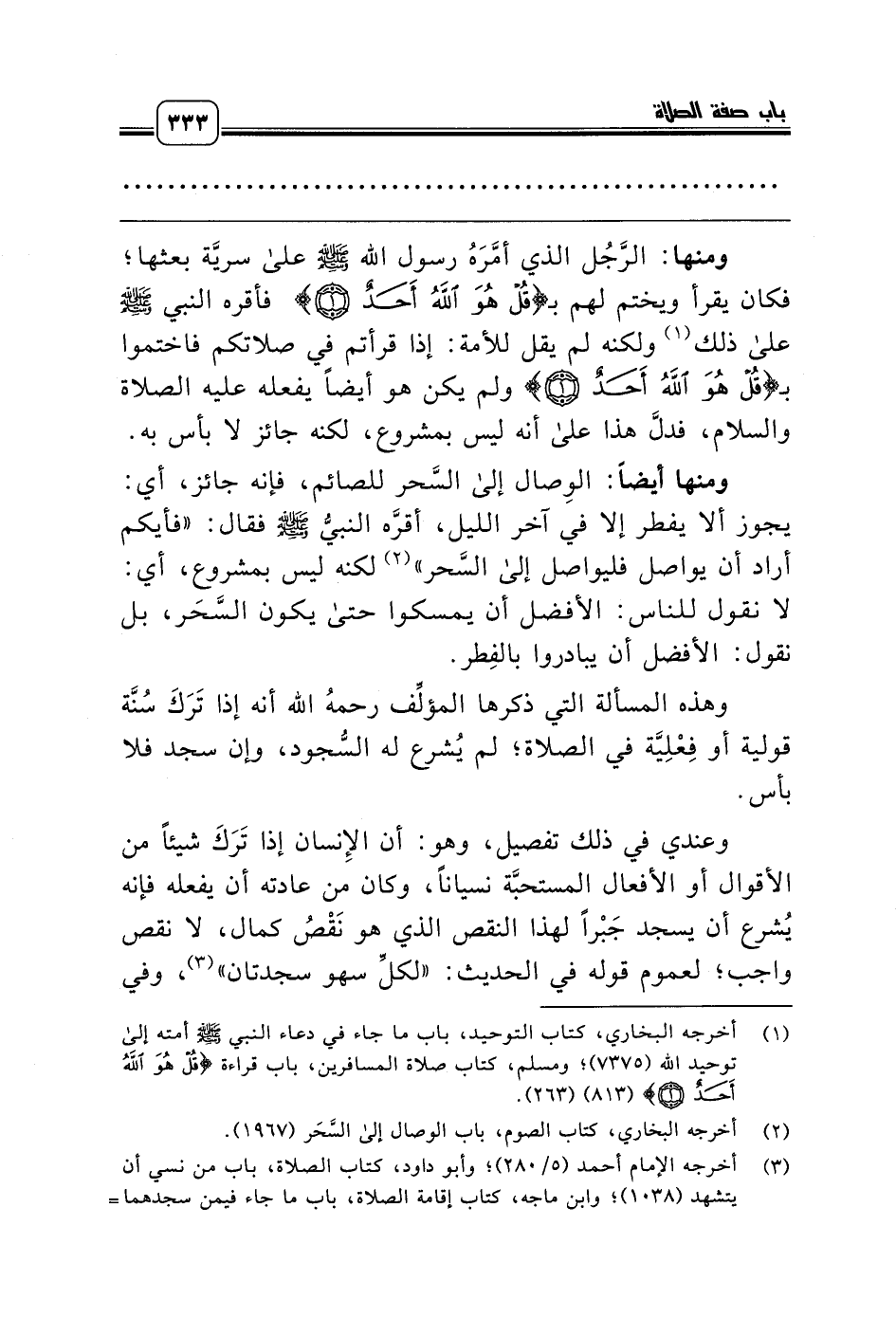 ومنها: الرَّجُل الذي أمَّرَهُ رسول الله صلّى الله عليه وسلّم على سريَّة بعثها؛ فكان يقرأ ويختم لهم بـ {قُلْ هُوَ اللَّهُ أَحَدٌ *} فأقره النبي صلّى الله عليه وسلّم على ذلك (¬1) ولكنه لم يقل للأمة: إذا قرأتم في صلاتكم فاختموا بـ {قُلْ هُوَ اللَّهُ أَحَدٌ *} ولم يكن هو أيضاً يفعله عليه الصلاة والسلام، فدلَّ هذا على أنه ليس بمشروع، لكنه جائز لا بأس به.
