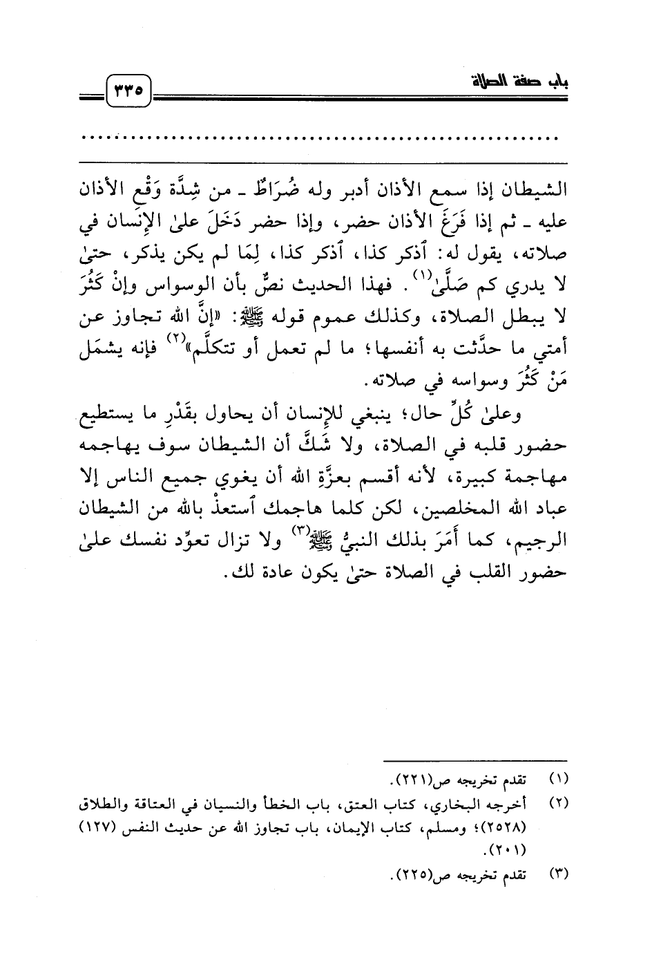 الشيطان إذا سمع الأذان أدبر وله ضُرَاطٌ ـ من شِدَّة وَقْعِ الأذان عليه ـ ثم إذا فَرَغَ الأذان حضر، وإذا حضر دَخَلَ على الإِنسان في صلاته، يقول له: اذكر كذا، اذكر كذا، لِمَا لم يكن يذكر، حتى لا يدري كم صَلَّى (¬1). فهذا الحديث نصٌّ بأن الوسواس وإنْ كَثُرَ لا يبطل الصلاة، وكذلك عموم قوله صلّى الله عليه وسلّم: «إنَّ الله تجاوز عن أمتي ما حدَّثت به أنفسها؛ ما لم تعمل أو تتكلَّم» (¬2) فإنه يشمَل مَنْ كَثُرَ وسواسه في صلاته.