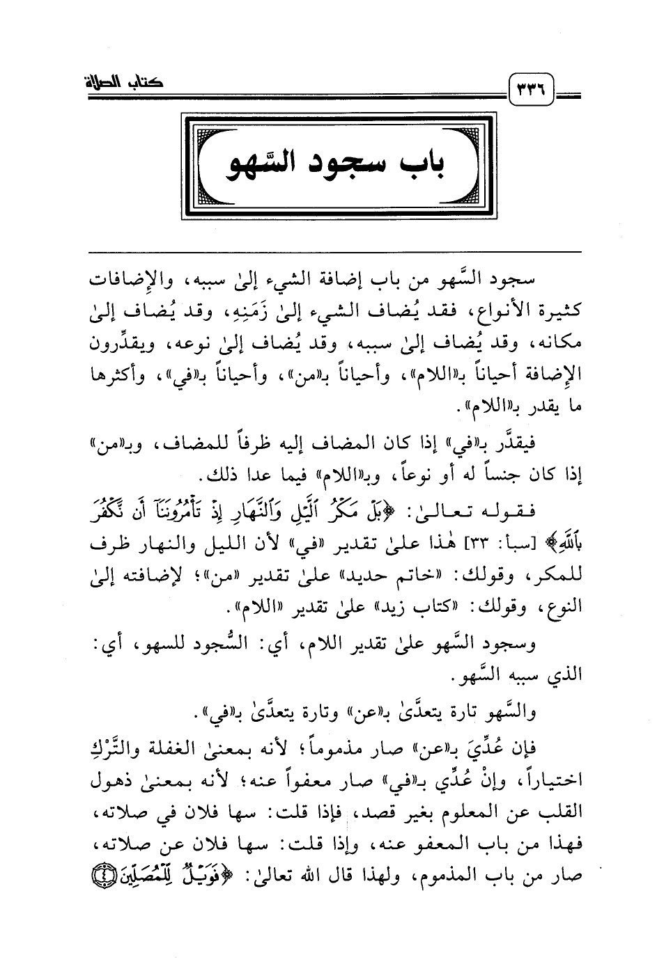 فإن عُدِّيَ بـ «عن» صار مذموماً؛ لأنه بمعنى الغفلة والتَّرْكِ اختياراً، وإنْ عُدِّي بـ «في» صار معفواً عنه؛ لأنه بمعنى ذهول القلب عن المعلوم بغير قصد، فإذا قلت: سها فلان في صلاته، فهذا من باب المعفو عنه، وإذا قلت: سها فلان عن صلاته، صار من باب المذموم، ولهذا قال الله تعالى: {فَوَيْلٌ لِلْمُصَلِّينَ *}
