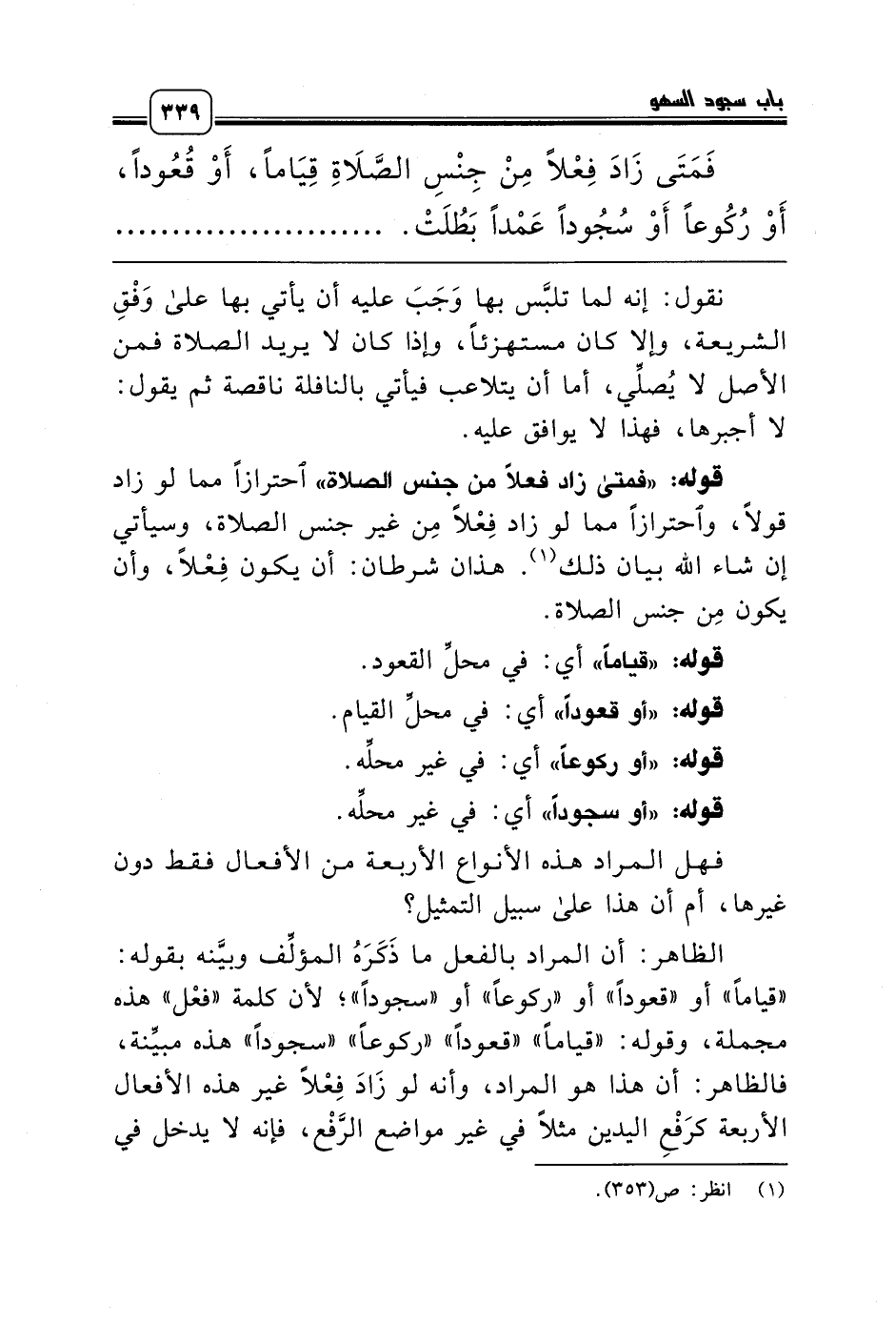 فَمَتَى زَادَ فِعْلاً مِنْ جِنْسِ الصَّلاَةِ قِيَاماً، أَوْ قُعُوداً، أَوْ رُكُوعاً أَوْ سُجُوداً عَمْداً بَطُلَتْ. ...........