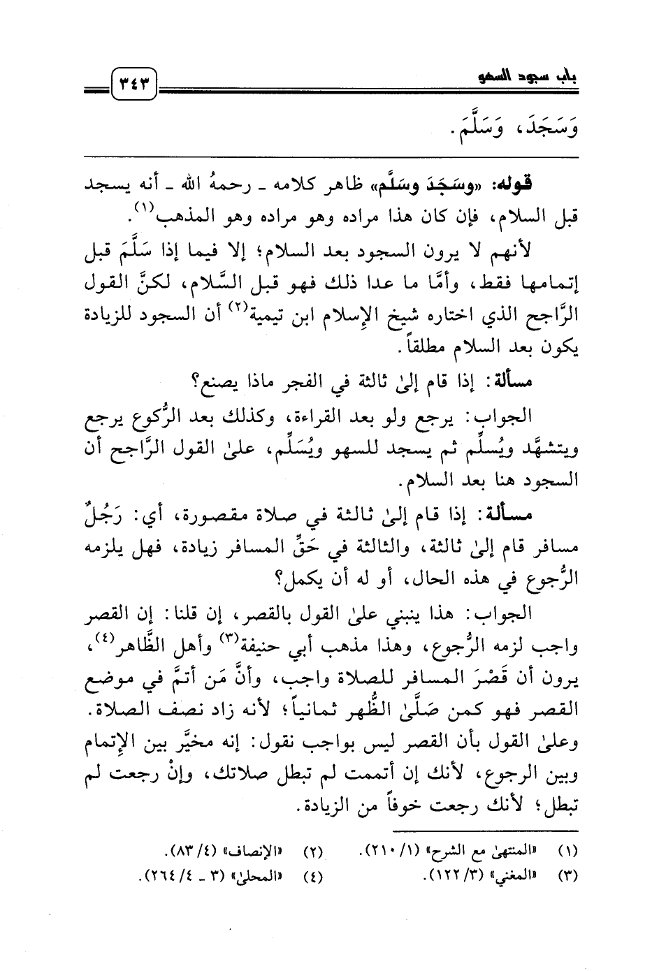 قوله: «وسَجَدَ وسَلَّم» ظاهر كلامه ـ رحمه الله ـ أنه يسجد قبل السلام، فإن كان هذا مراده وهو مراده وهو المذهب (¬1).