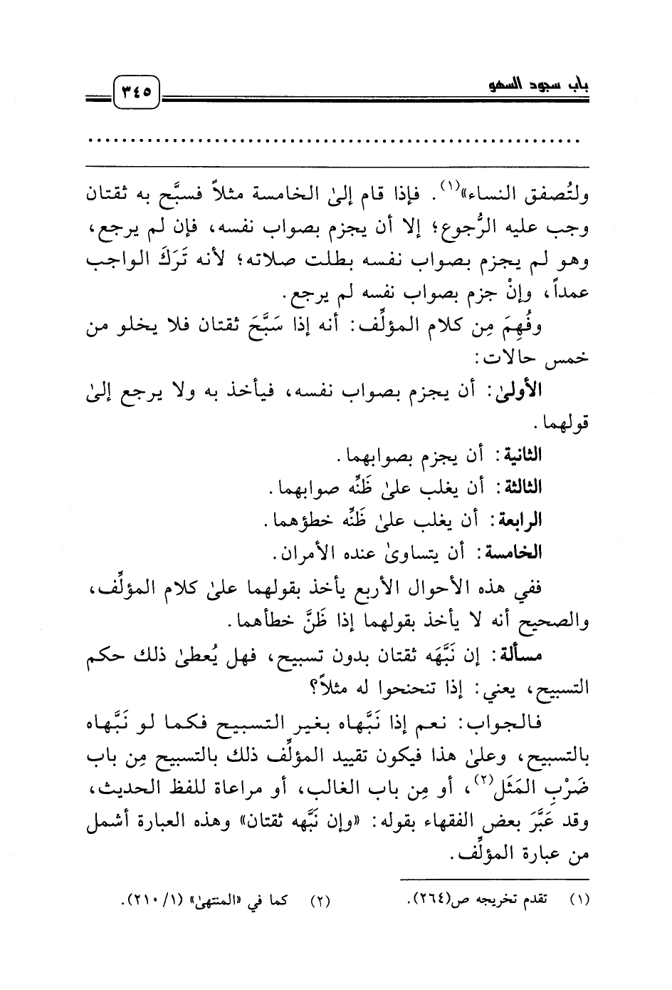 ولتُصفق النساء» (¬1). فإذا قام إلى الخامسة مثلاً فسبَّح به ثقتان وجب عليه الرُّجوع؛ إلا أن يجزم بصواب نفسه، فإن لم يرجع، وهو لم يجزم بصواب نفسه بطلت صلاته؛ لأنه تَرَكَ الواجب عمداً، وإنْ جزم بصواب نفسه لم يرجع.