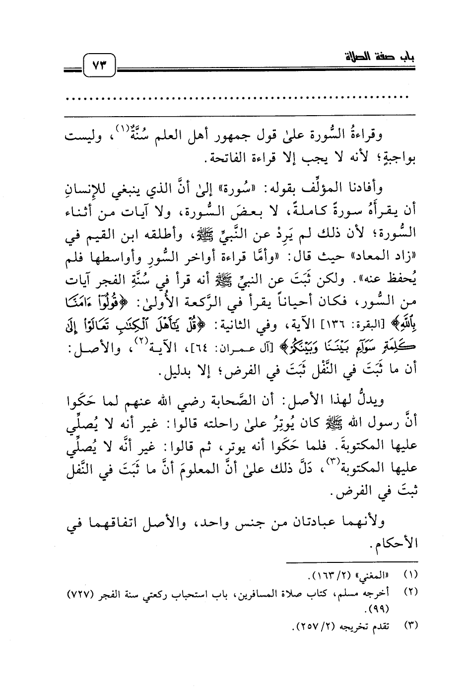 وأفادنا المؤلِّف بقوله: «سُورة» إلى أنَّ الذي ينبغي للإِنسانِ أن يقرأَهُ سورةً كاملةً، لا بعضَ السُّورة، ولا آيات من أثناء السُّورة؛ لأن ذلك لم يَرِدْ عن النَّبيِّ صلّى الله عليه وسلّم، وأطلقه ابن القيم في «زاد المعاد» حيث قال: «وأمَّا قراءة أواخر السُّورِ وأواسطها فلم يُحفظ عنه». ولكن ثَبَتَ عن النبيِّ صلّى الله عليه وسلّم أنه قرأ في سُنَّةِ الفجر آيات من السُّور، فكان أحياناً يقرأ في الرَّكعة الأُولى: {قُولُوا آمَنَّا بِاللَّهِ} [البقرة: 136] الآية، وفي الثانية: {قُلْ يَاأَهْلَ الْكِتَابِ تَعَالَوْا إِلَى كَلِمَةٍ سَوَاءٍ بَيْنَنَا وَبَيْنَكُمْ} [آل عمران: 64]، الآية (¬2)، والأصل: أن ما ثَبَتَ في النَّفْل ثَبَتَ في الفرض؛ إلا بدليل.