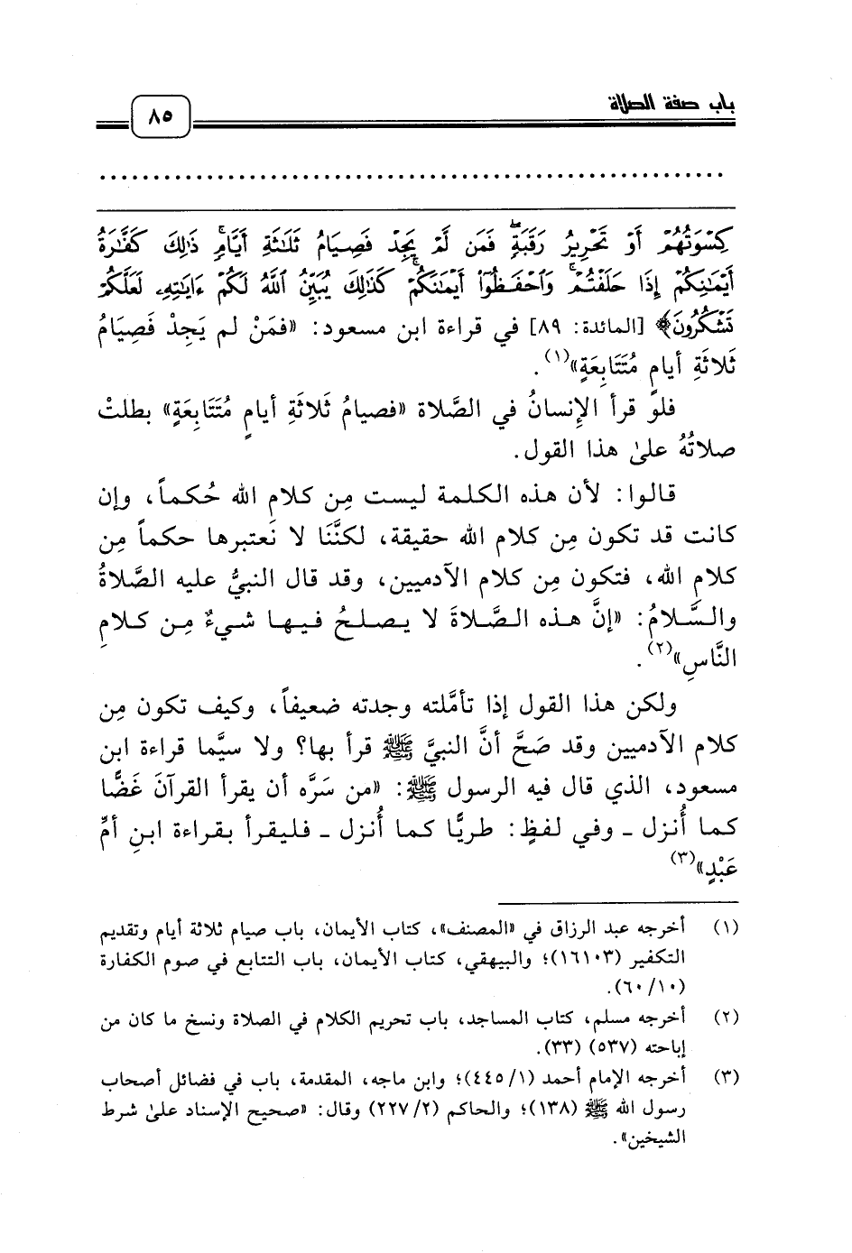 كِسْوَتُهُمْ أَوْ تَحْرِيرُ رَقَبَةٍ فَمَنْ لَمْ يَجِدْ فَصِيامُ ثَلاَثَةِ أَيَّامٍ ذَلِكَ كَفَّارَةُ أَيْمَانِكُمْ إِذَا حَلَفْتُمْ وَاحْفَظُوا أَيْمَانَكُمْ كَذَلِكَ يُبَيِّنُ اللَّهُ لَكُمْ آيَاتِهِ لَعَلَّكُمْ تَشْكُرُونَ} [المائدة: 89] في قراءة ابن مسعود: «فمَنْ لم يَجِدْ فَصِيَامُ ثَلاثَةِ أيامٍ مُتَتَابِعَةٍ» (¬1).