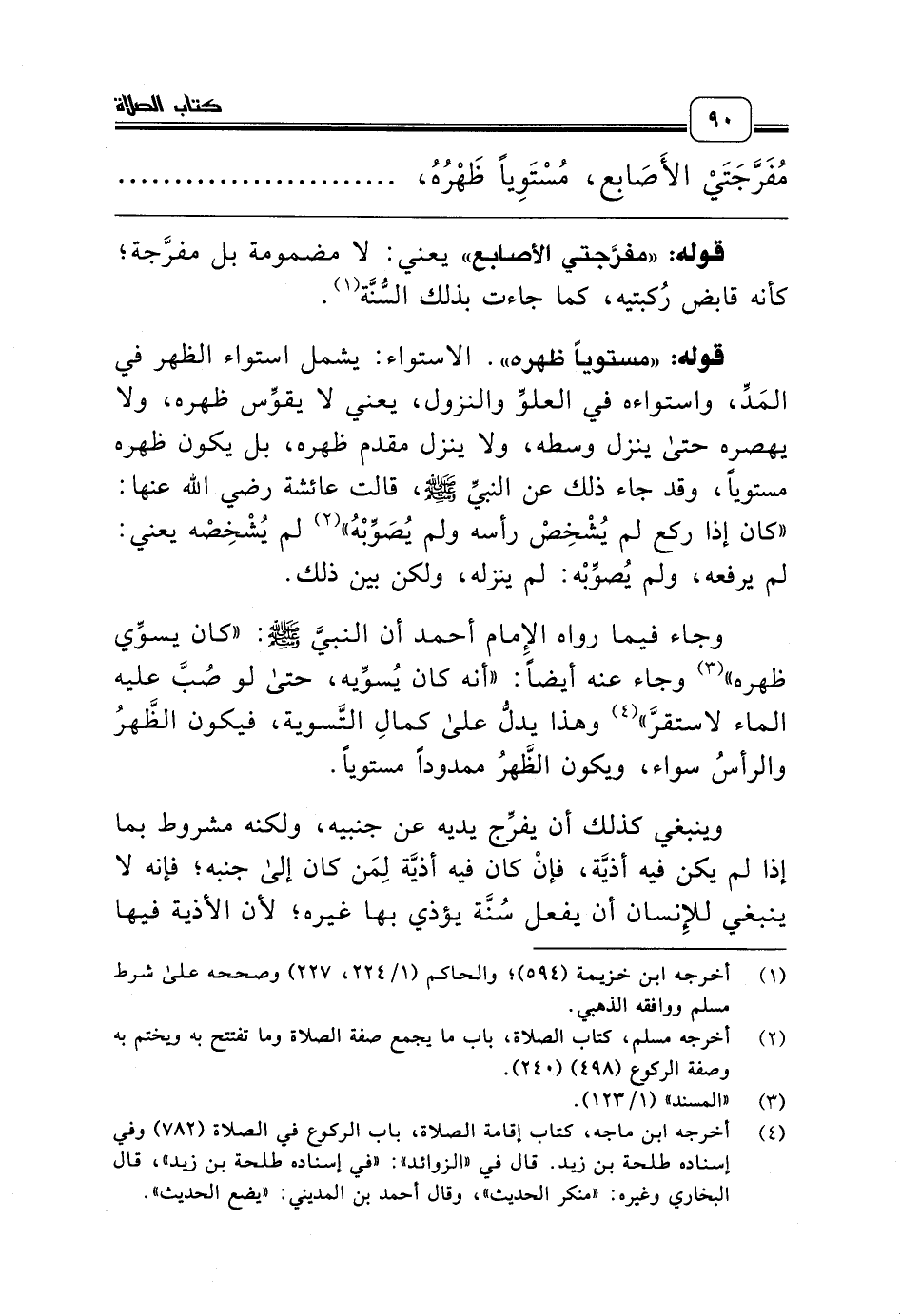 وجاء فيما رواه الإِمام أحمد أن النبيَّ صلّى الله عليه وسلّم: «كان يسوِّي ظهره» (¬3) وجاء عنه أيضاً: «أنه كان يُسوِّيه، حتى لو صُبَّ عليه الماء لاستقرَّ» (¬4) وهذا يدلُّ على كمالِ التَّسوية، فيكون الظَّهرُ والرأسُ سواء، ويكون الظَّهرُ ممدوداً مستوياً.