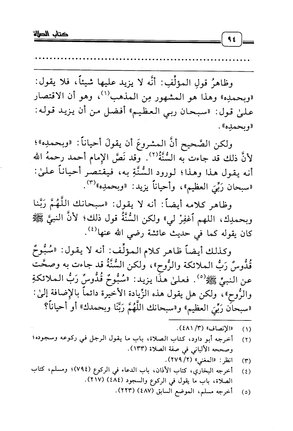 وكذلك أيضاً ظاهر كلام المؤلِّف: أنه لا يقول: «سُبُّوحٌ قُدُّوسٌ رَبُّ الملائكة والرُّوحِ»، ولكن السُّنَّةُ قد جاءت به وصحَّت عن النبيِّ صلّى الله عليه وسلّم (¬5). فعلى هذا يزيد: «سُبُّوحٌ قُدُّوسٌ رَبُّ الملائكةِ والرُّوحِ»، ولكن هل يقول هذه الزِّيادة الأخيرة دائماً بالإِضافة إلى: «سبحان رَبِّيَ العظيم» و «سبحانك اللَّهُمَّ رَبَّنَا وبحمدك» أو أحياناً؟