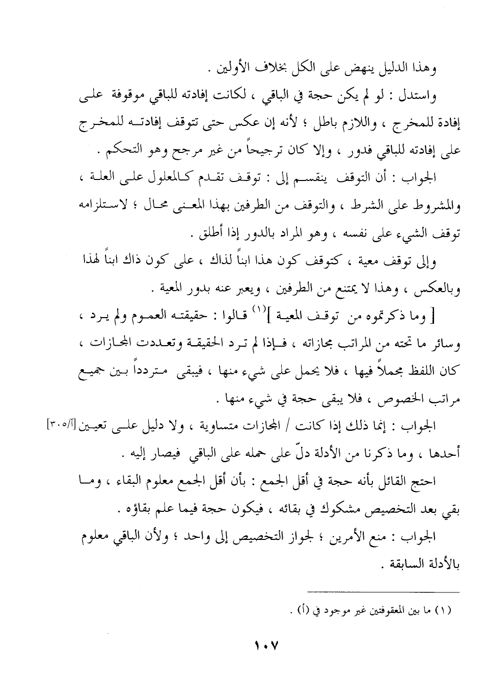 [وما ذكرتموه من توقف المعية] قالوا: حقيقته العموم ولم يرد, وسائر ما تحته من المراتب مجازاته, فإذا لم ترد الحقيقة وتعددت المجازات, كان اللفظ مجملًا فيها, فلا يحمل على شيء منها, فيبقى مترددًا بين جميع مراتب الخصوص, فلا يبقى حجة في شيء منها.