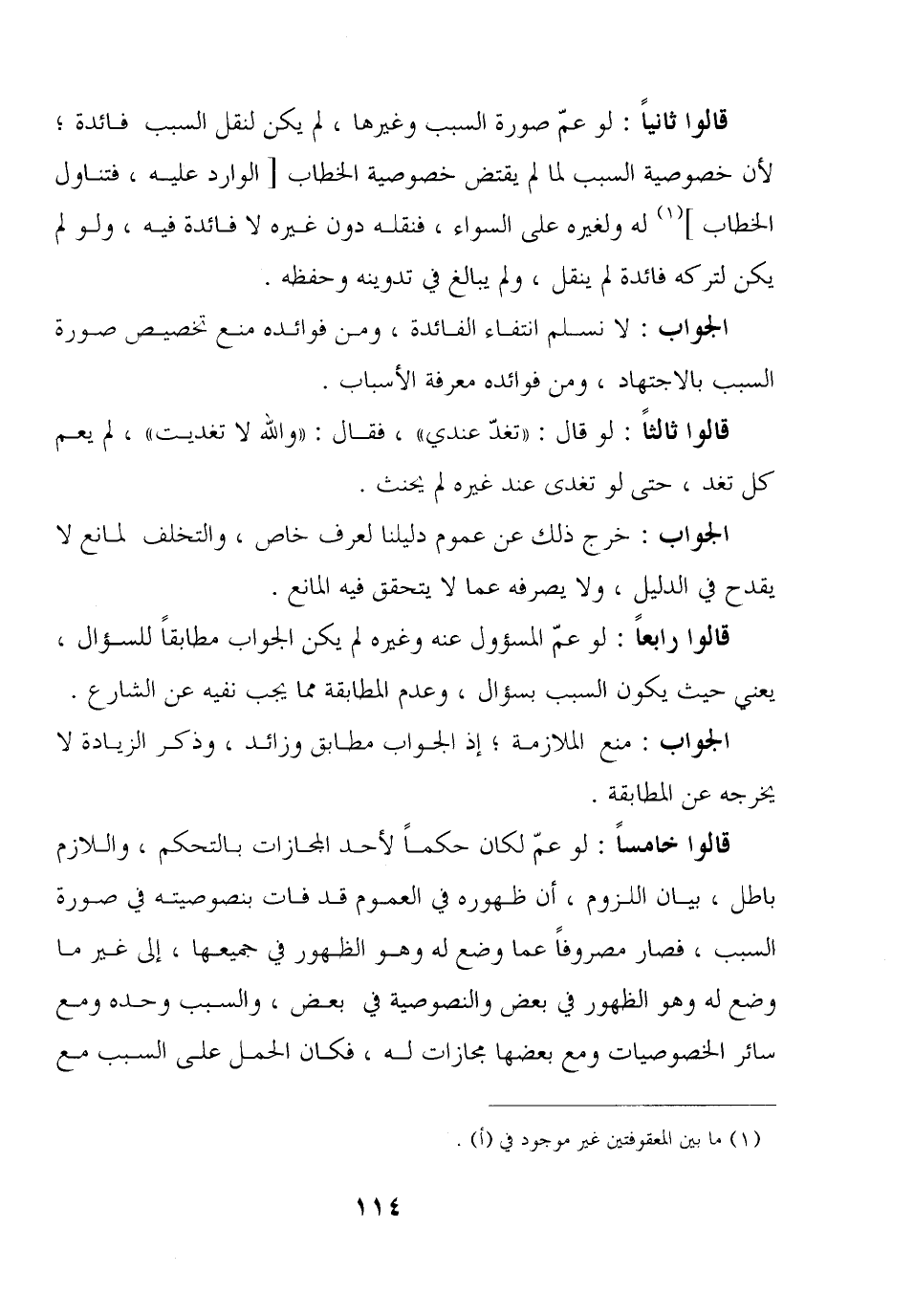 قالوا ثانيًا: لو عمّ صورة السبب وغيرها, لم يكن لنقل السبب فائدة؛ لأن خصوصية السبب لما لم يقتض خصوصية الخطاب [الوارد عليها, فتناول الخطاب] له ولغيره على السواء, فنقله دون غيره لا فائدة فيه, ولو لم يكن لتركه فائدة لم ينقل, ولم يبالغ في تدوينه وحفظه.