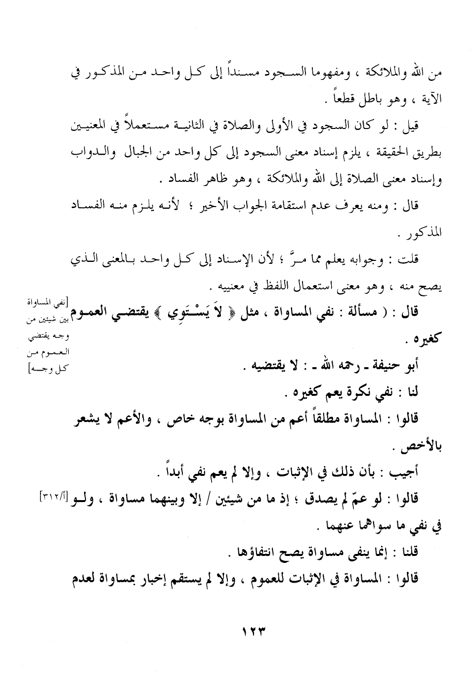 قال: (مسألة: نفي المساواة, مثل {لا يستوي} يقتضي العموم كغيره.