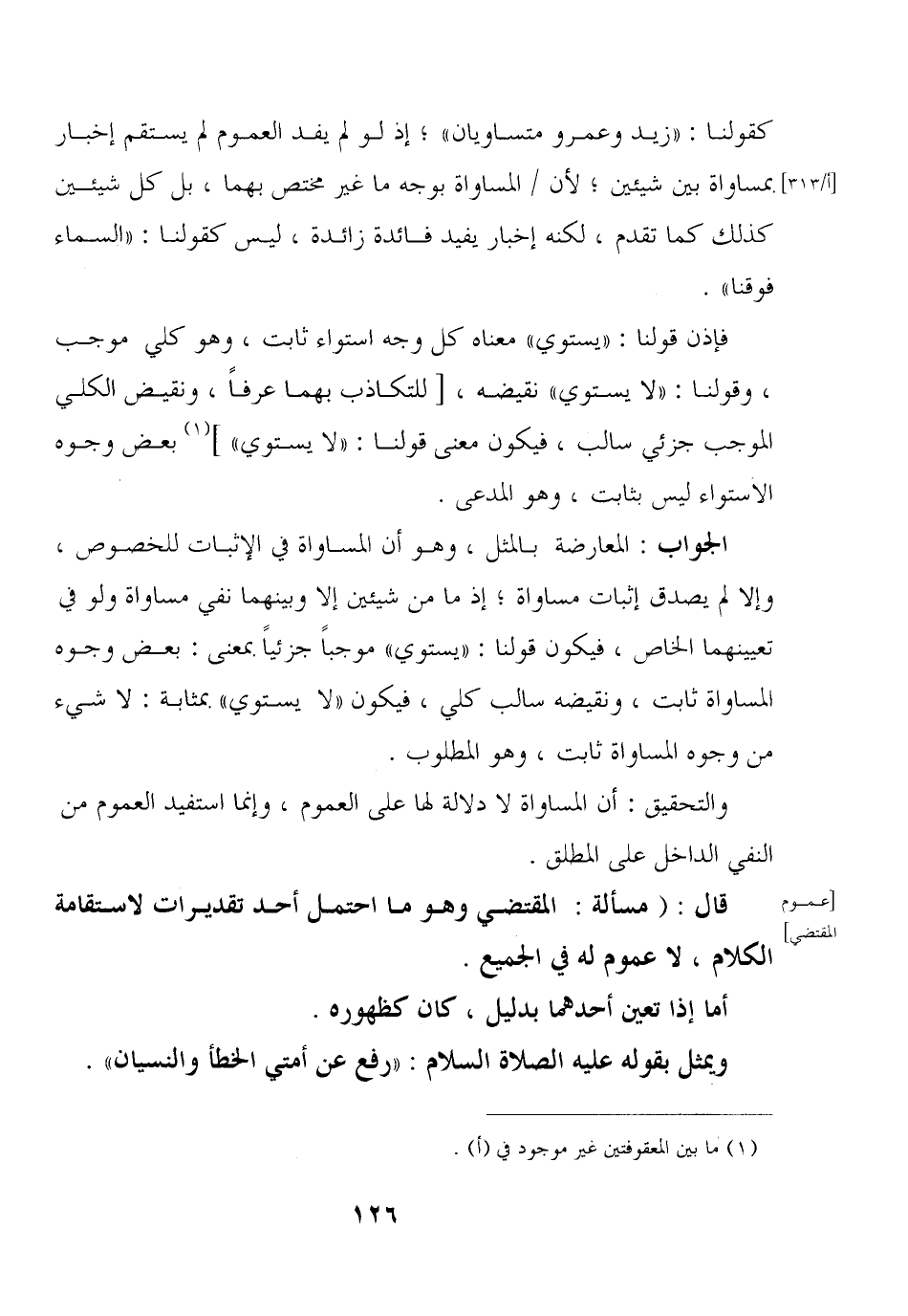 فإذن قولنا: «يستوي» معناه كل وجه استواء ثابت, وهو كلي موجب, وقولنا: «لا يستوي» نقيضه, [للتكاذب بهما عرفًا, ونقيض الكلي الموجب جزئي سالب, فيكون معنى قولنا: «لا يستوي»] بعض وجوه الاستواء ليس بثابت, وهو المدعى.