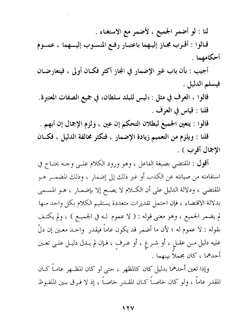 أقول: المقتضي بصيغة الفاعل, وهو ورود الكلام على وجه يحتاج في استقامته من صيانته عن الكذب أو غير ذلك إلى إضمار, وذلك المضمر هو المقتضي, ودلالة الدليل على أن الكلام لا يصح إلا بإضمار, هو المسمى بدلالة الاقتضاء, فإن احتمل تقديرات متعددة يستقيم الكلام بكل واحد منها لم يضمر الجميع, وهو معنى قوله: (لا عموم له في الجميع) , ولم يكتف بقوله: لا عموم له؛ لأن ما أضمر قد يكون عامًا فيقدر واحد معين إن دلّ عليه دليل من عقلٍ, أو شرعٍ, أو عرفٍ, فإن لم يدل دليل على تعين أحدهما, كان مجملًا بينهما.