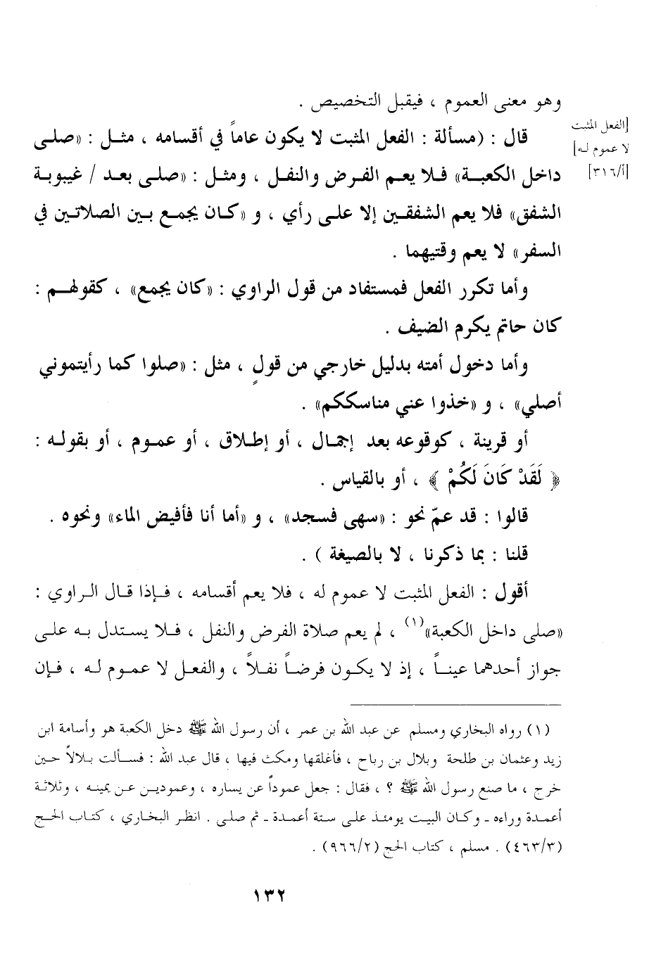 قال: (مسألة: الفعل المثبت لا يكون عامًا في أقسامه, مثل: «صلى داخل الكعبة» فلا يعم الفرض والنفل, ومثل: «صلى بعد / غيبوبة الشفق» فلا يعم الشفقين إلا على رأي, و «كان يجمع بين الصلاتين في السفر» لا يعم وقتيهما.