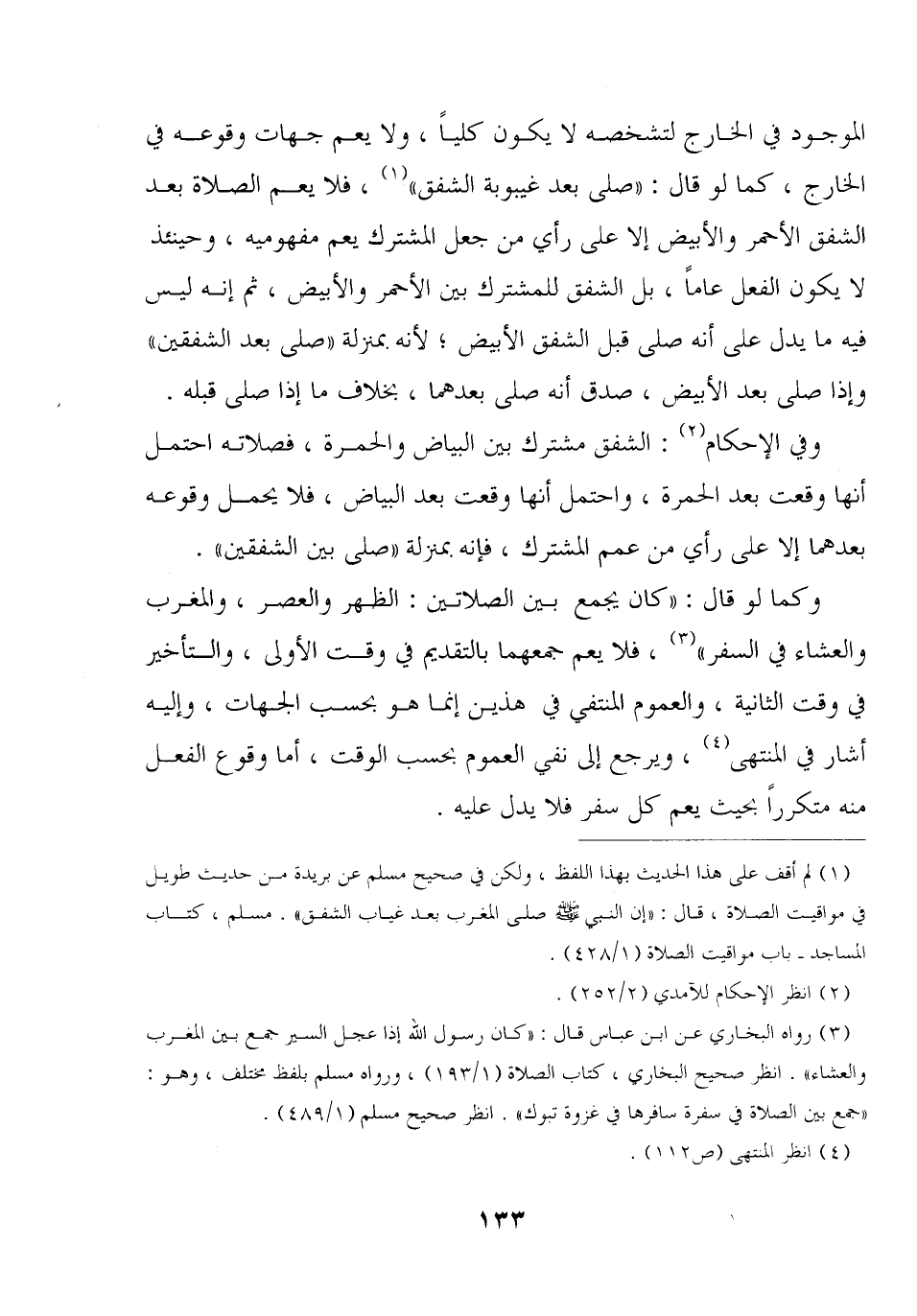 الموجود في الخارج لتشخصه لا يكون كليًا, ولا يعم جهات وقوعه في الخارج, كما لو قال: «صلى بعد غيبوبة الشفق» , فلا يعم الصلاة بعد الشفق الأحمر والأبيض إلا على رأي من جعل المشترك يعم مفهوميه, وحينئذ لا يكون الفعل عامًا, بل الشفق للمشترك بين الأحمر والأبيض, ثم إنه ليس فيه ما يدل على أنه صلى قبل الشفق الأبيض؛ لأنه بمنزلة «صلى بعد الشفقين» وإذا صلى بعد الأبيض, صدق أنه صلى بعدهما, بخلاف ما إذا صلى قبله.