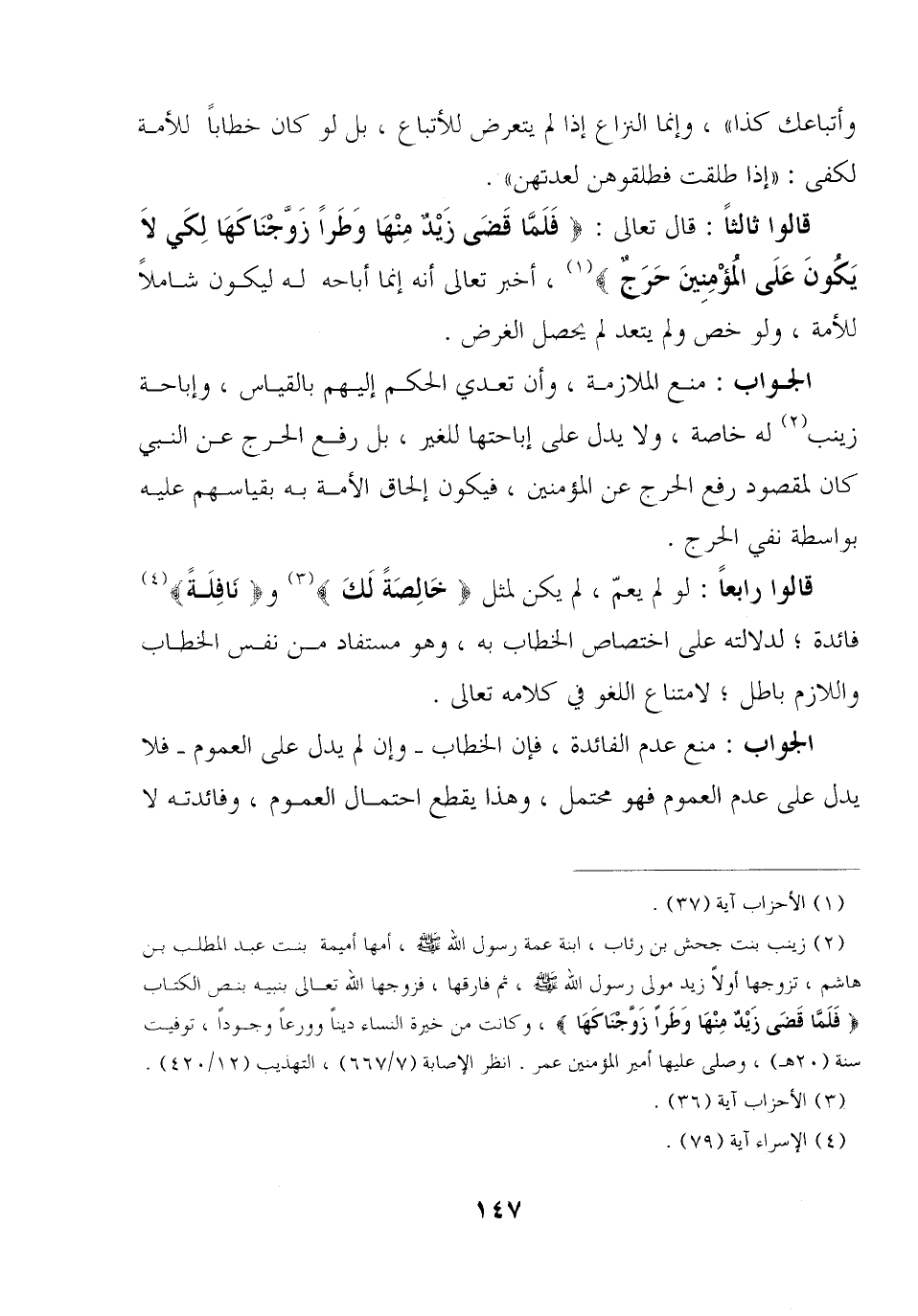 الجواب: منع الملازمة, وأن تعدي الحكم إليهم بالقياس, وإباحة زينب له خاصة, ولا يدل على إباحتها للغير, بل رفع الحرج عن النبي كان لمقصود رفع الحرج عن المؤمنين, فيكون إلحاق الأمة به بقياسهم عليه بواسطة نفي الحرج.