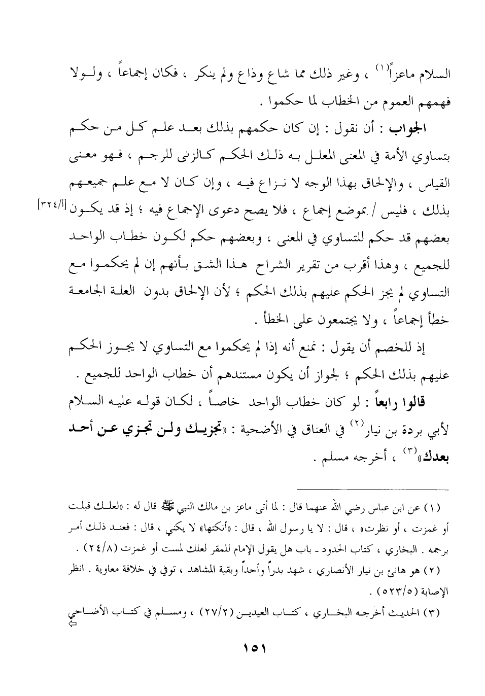 قالوا رابعًا: لو كان خطاب الواحد خاصًا, لكان قوله عليه السلام لأبي بردة بن نيار في العناق في الأضحية: «تجزيك ولن تجزي عن أحد بعدك» , أخرجه مسلم.