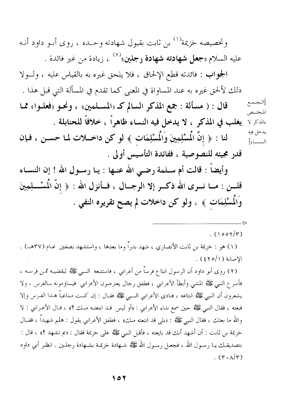 وتخصيصه خزيمة بن ثابت بقبول شهادته وحده, روى أبو داود أنه عليه السلام «جعل شهادته شهادة رجلين» , زيادة من غير فائدة.