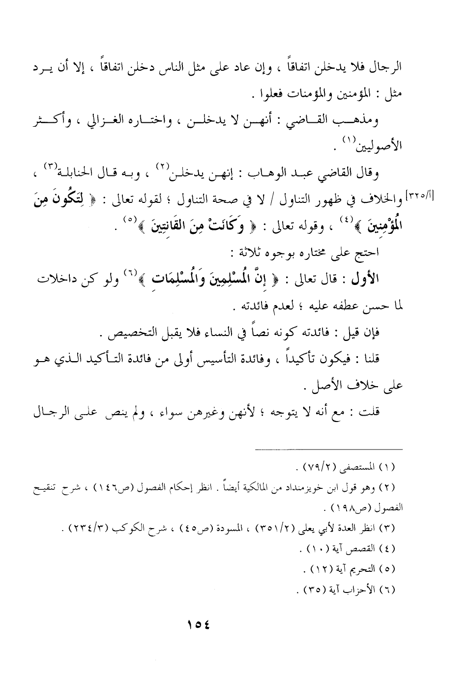 وقال القاضي عبد الوهاب: إنهن يدخلن, وبه قال الحنابلة, والخلاف في ظهور التناول / لا في صحة التناول؛ لقوله تعالى: {لتكون من المؤمنين} , وقوله تعالى: {وكانت من القانتين}.