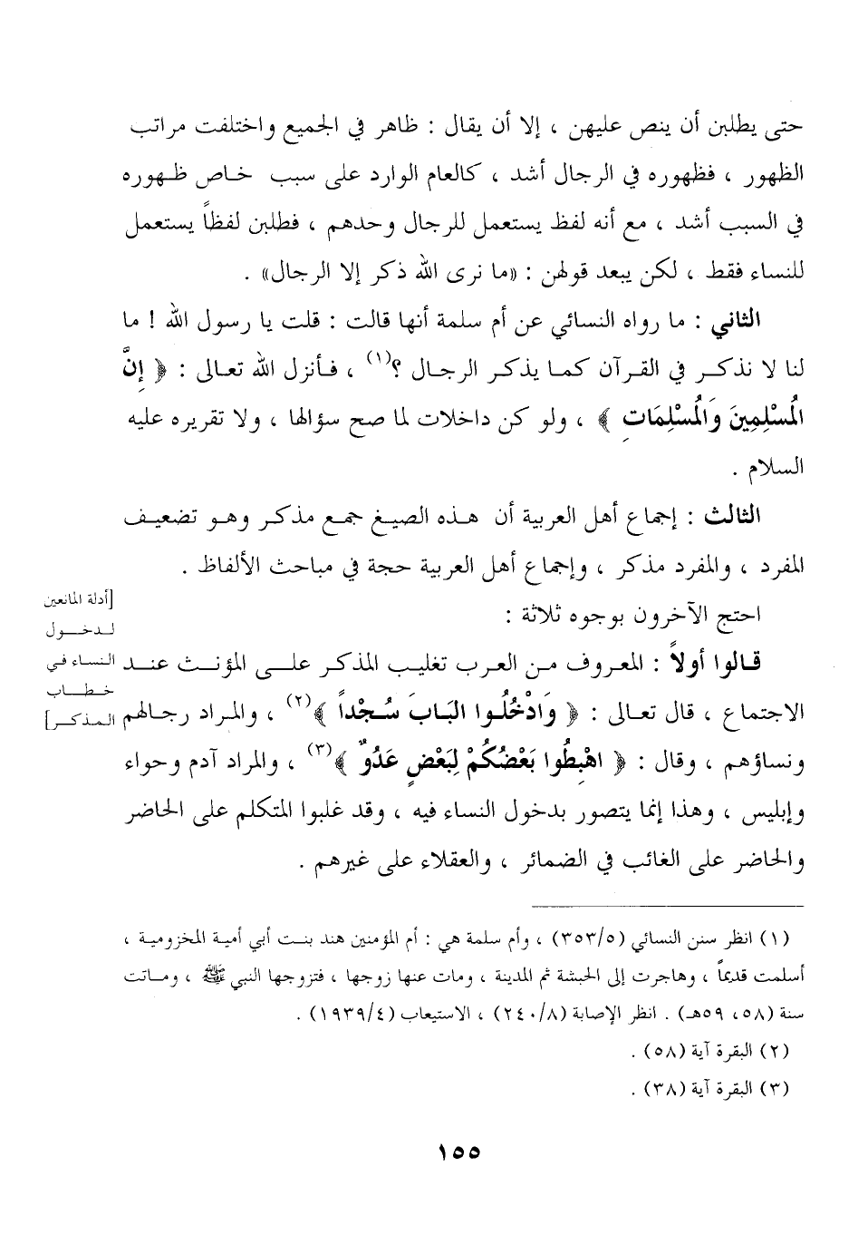 الثاني: ما رواه النسائي عن أم سلمة أنها قالت: قلت يا رسول الله! ما لنا لا نذكر في القرآن كما يذكر الرجال؟ , فأنزل الله تعالى: {إن المسلمين والمسلمات} , ولو كن داخلات لما صح سؤالها, ولا تقريره عليه السلام.